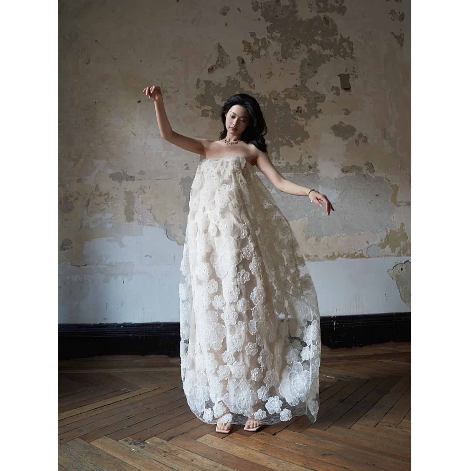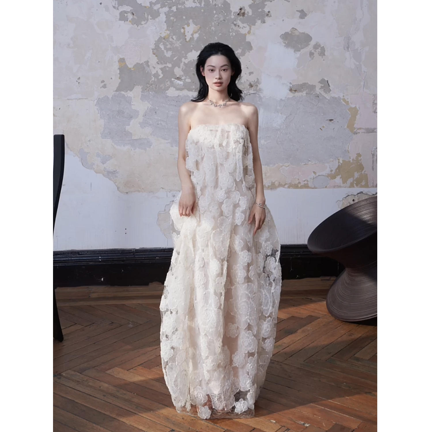小眾輕奢重工立體花朵裹胸裙花苞裙婚禮晨袍洋裝生日聚會小禮服