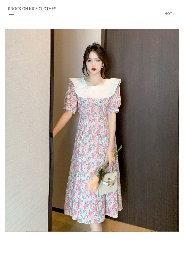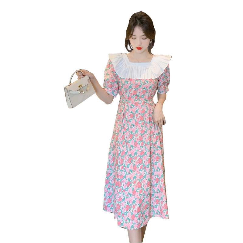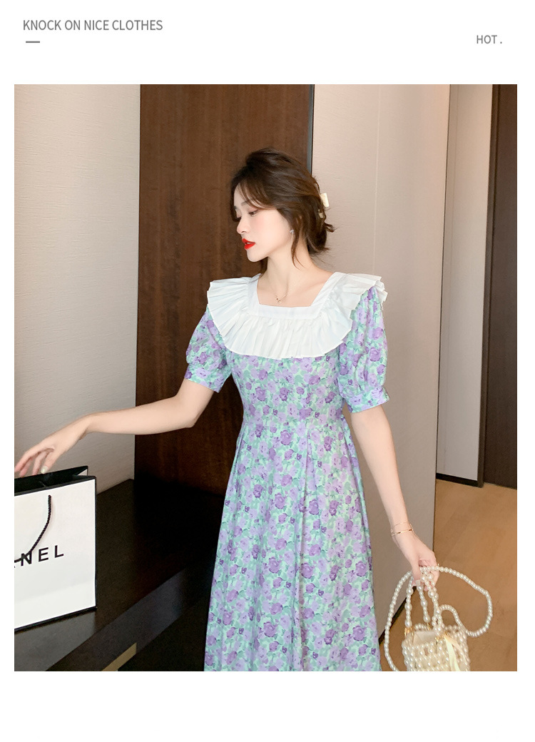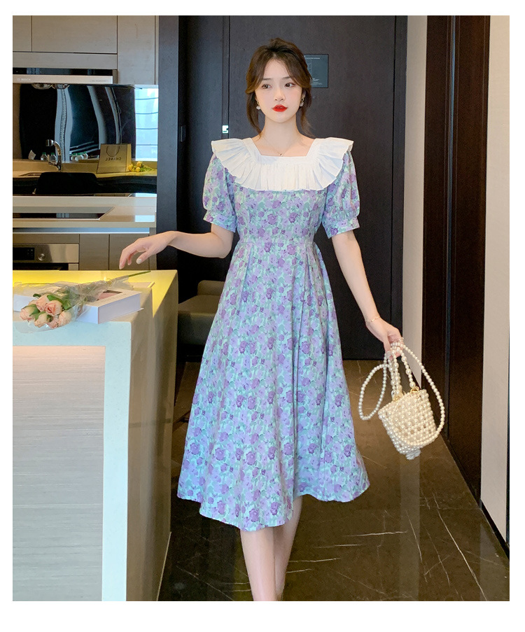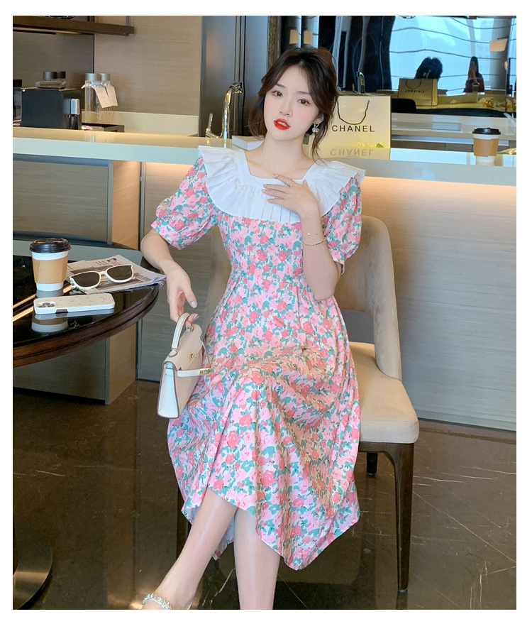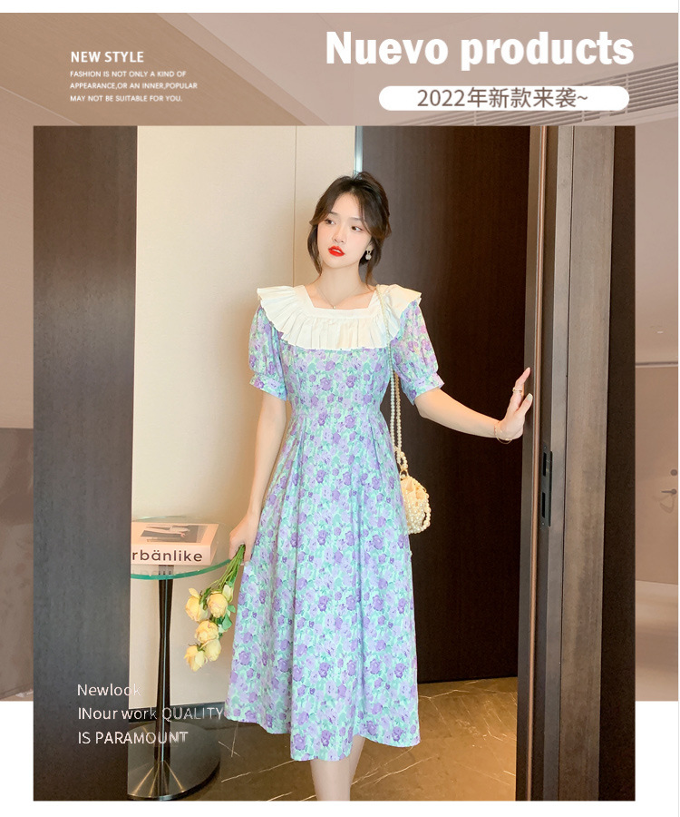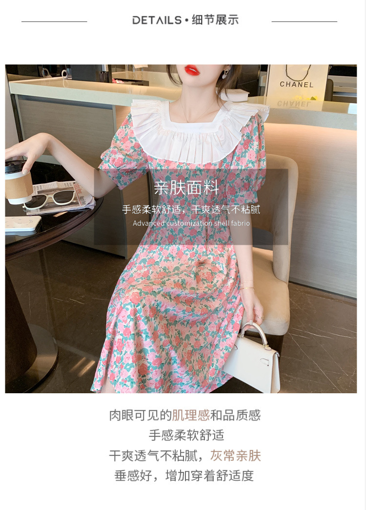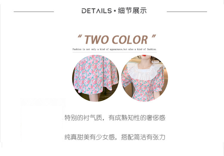 实拍2023夏季新款法式复古甜美拼接荷叶边方领碎花连衣裙清新裙子