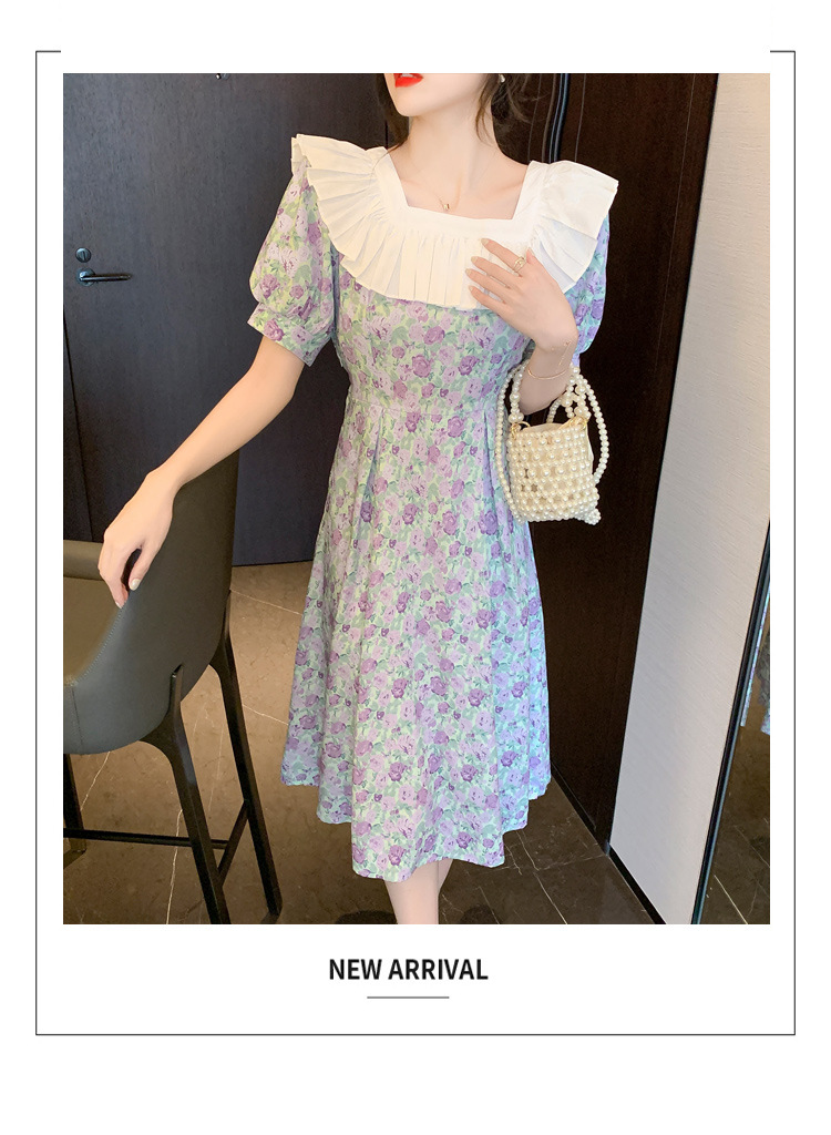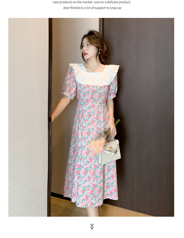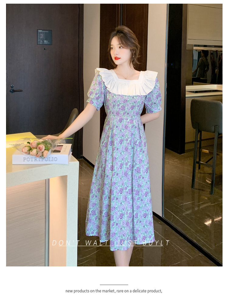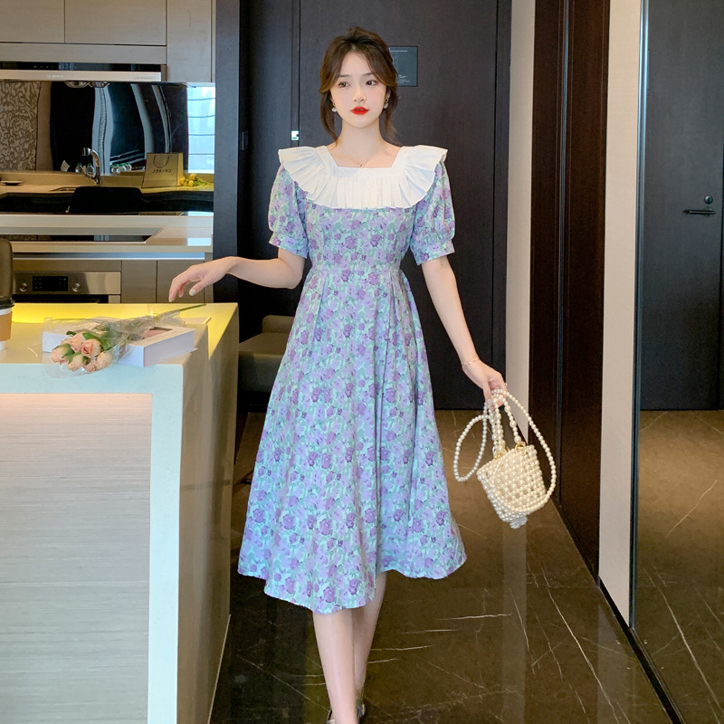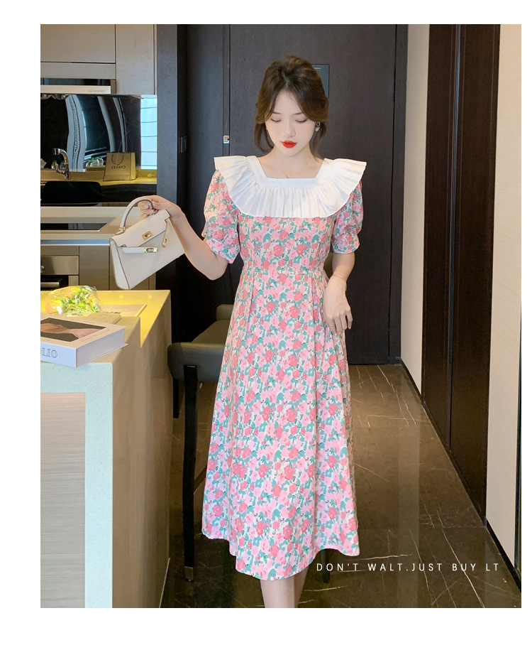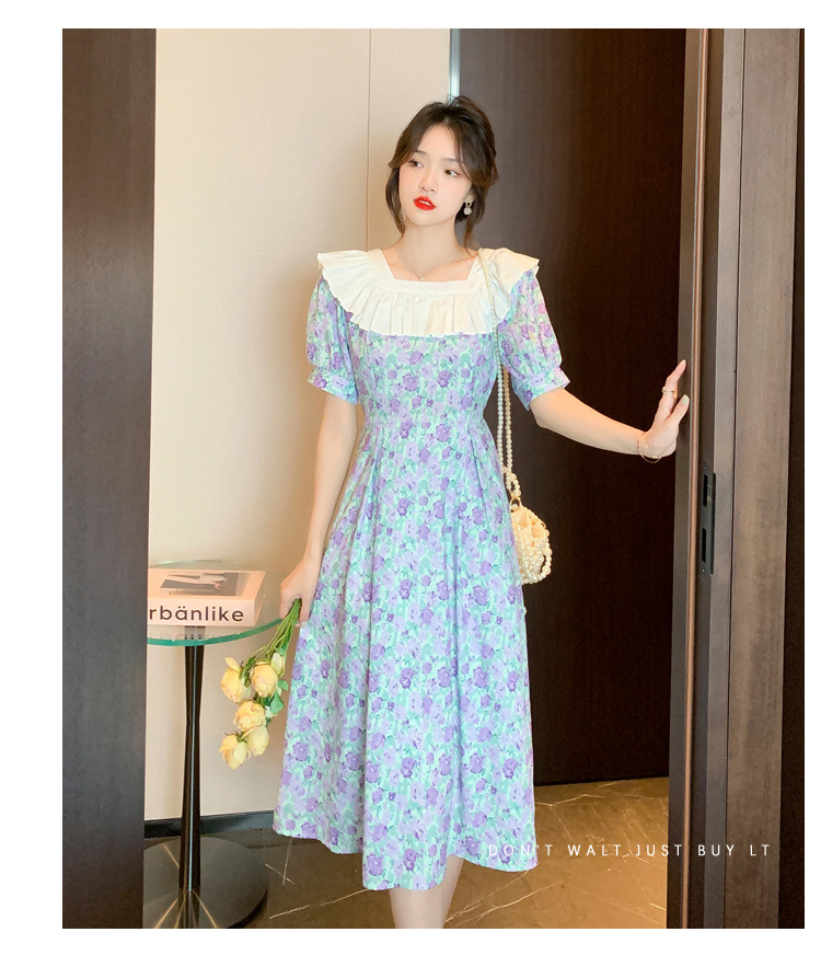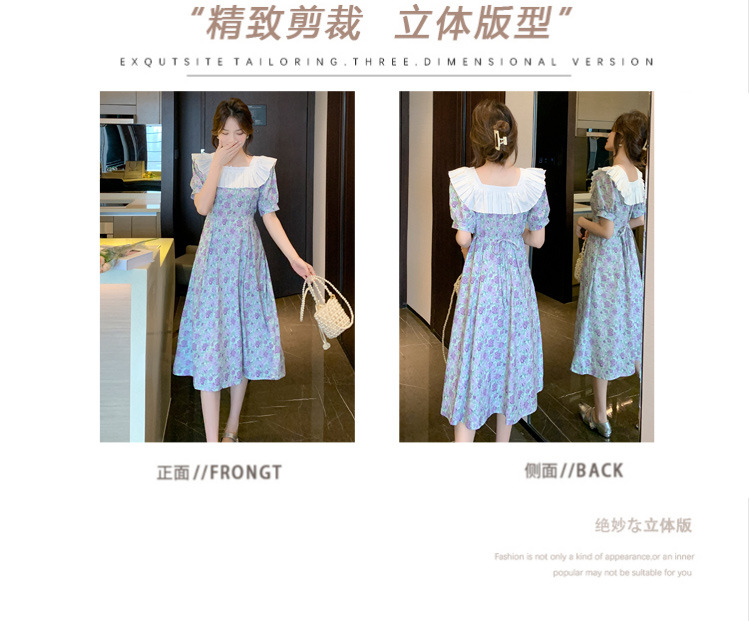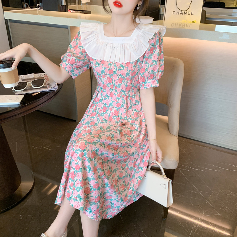 实拍2023夏季新款法式复古甜美拼接荷叶边方领碎花连衣裙清新裙子