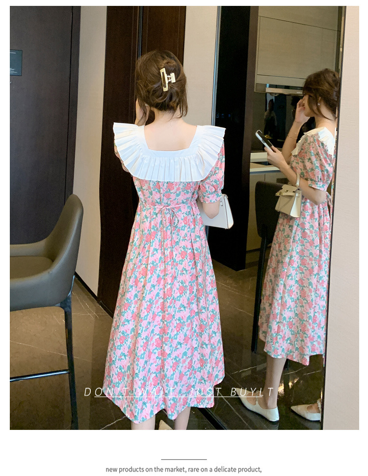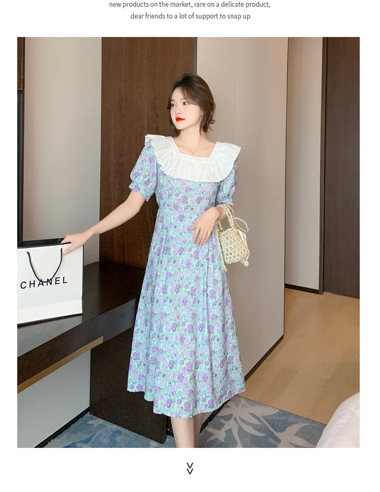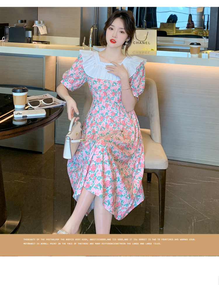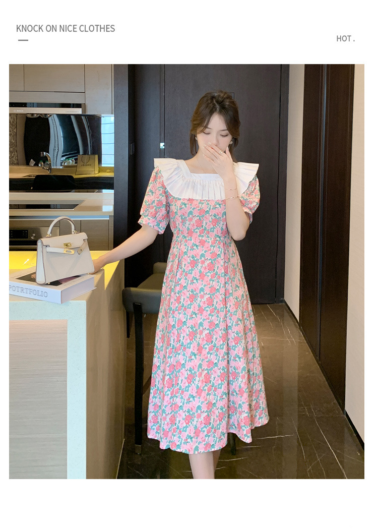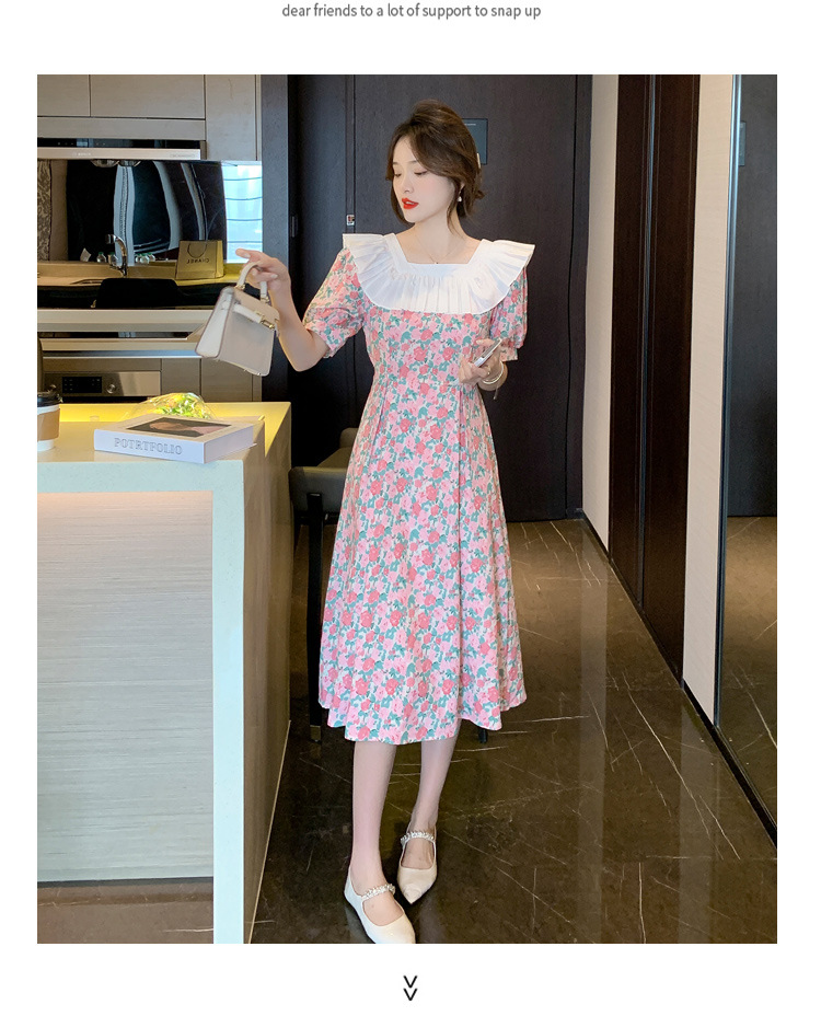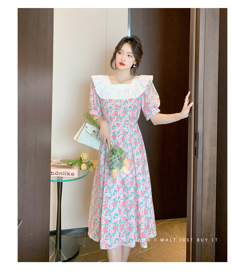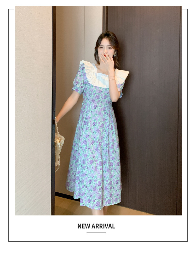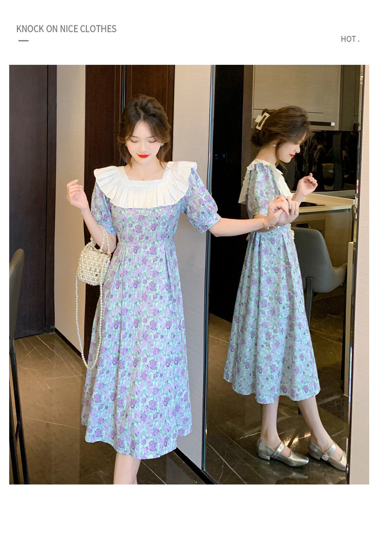 实拍2023夏季新款法式复古甜美拼接荷叶边方领碎花连衣裙清新裙子