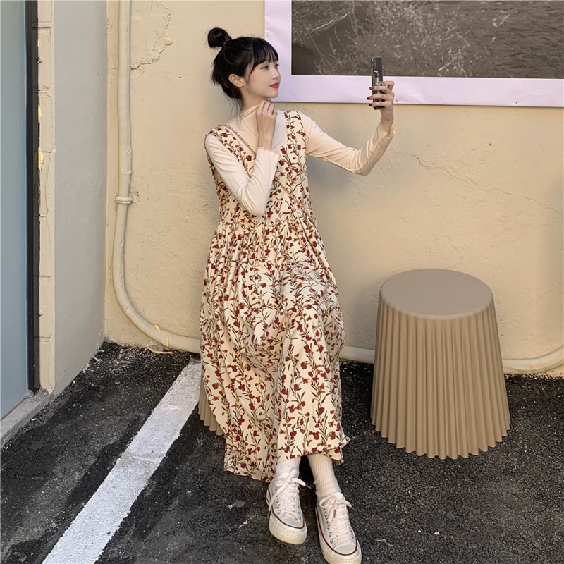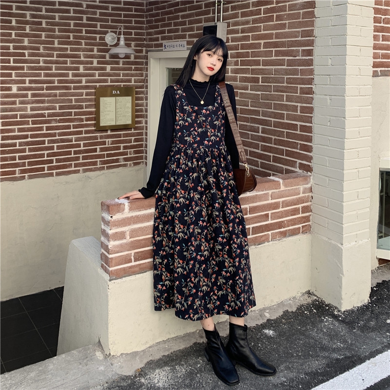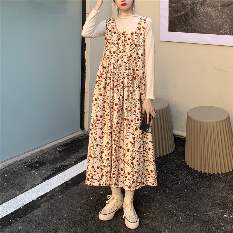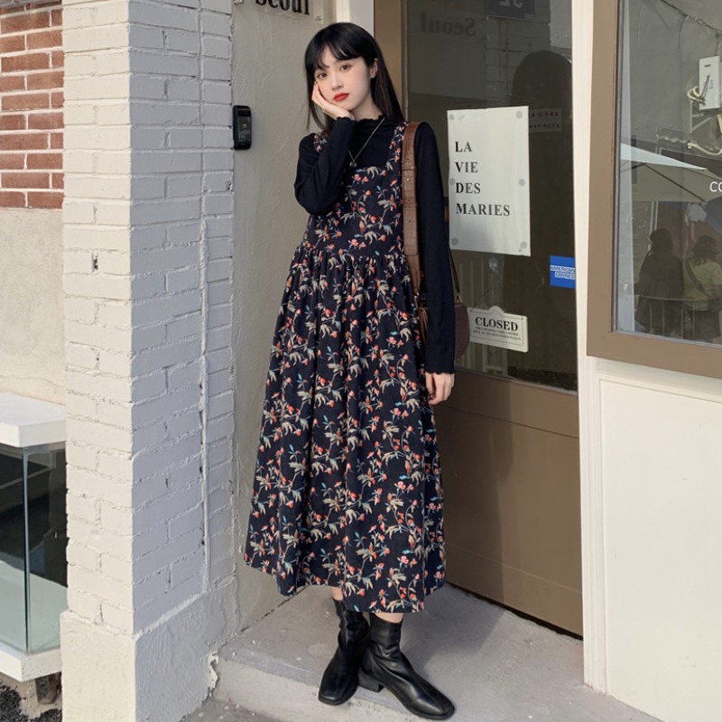 顏色分類 藏青色抱嬰袋碎花洋裝 杏色抱嬰袋碎花洋裝 黑色毛衣+藏青抱嬰袋碎花洋裝 杏色打底+杏色抱嬰袋碎花洋裝