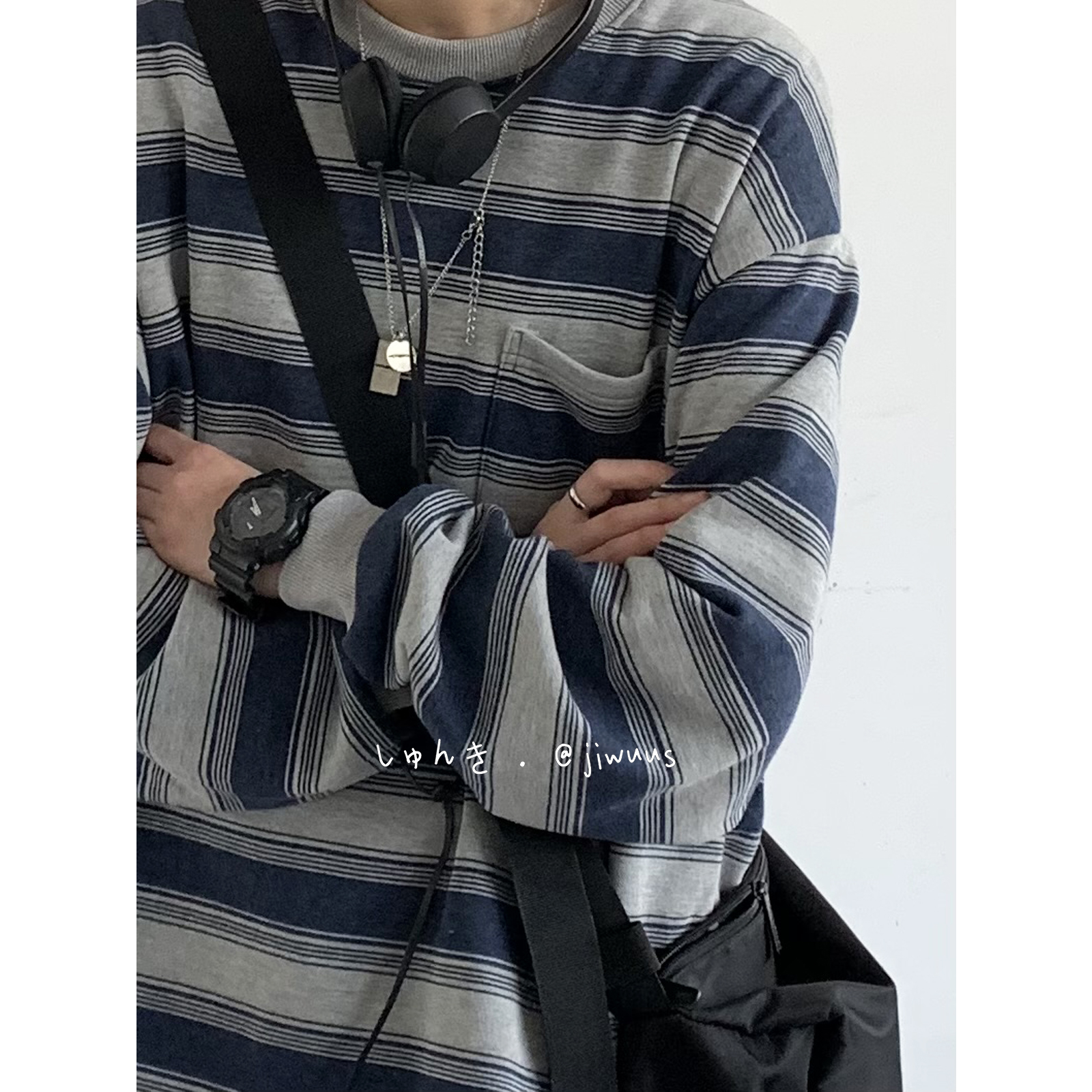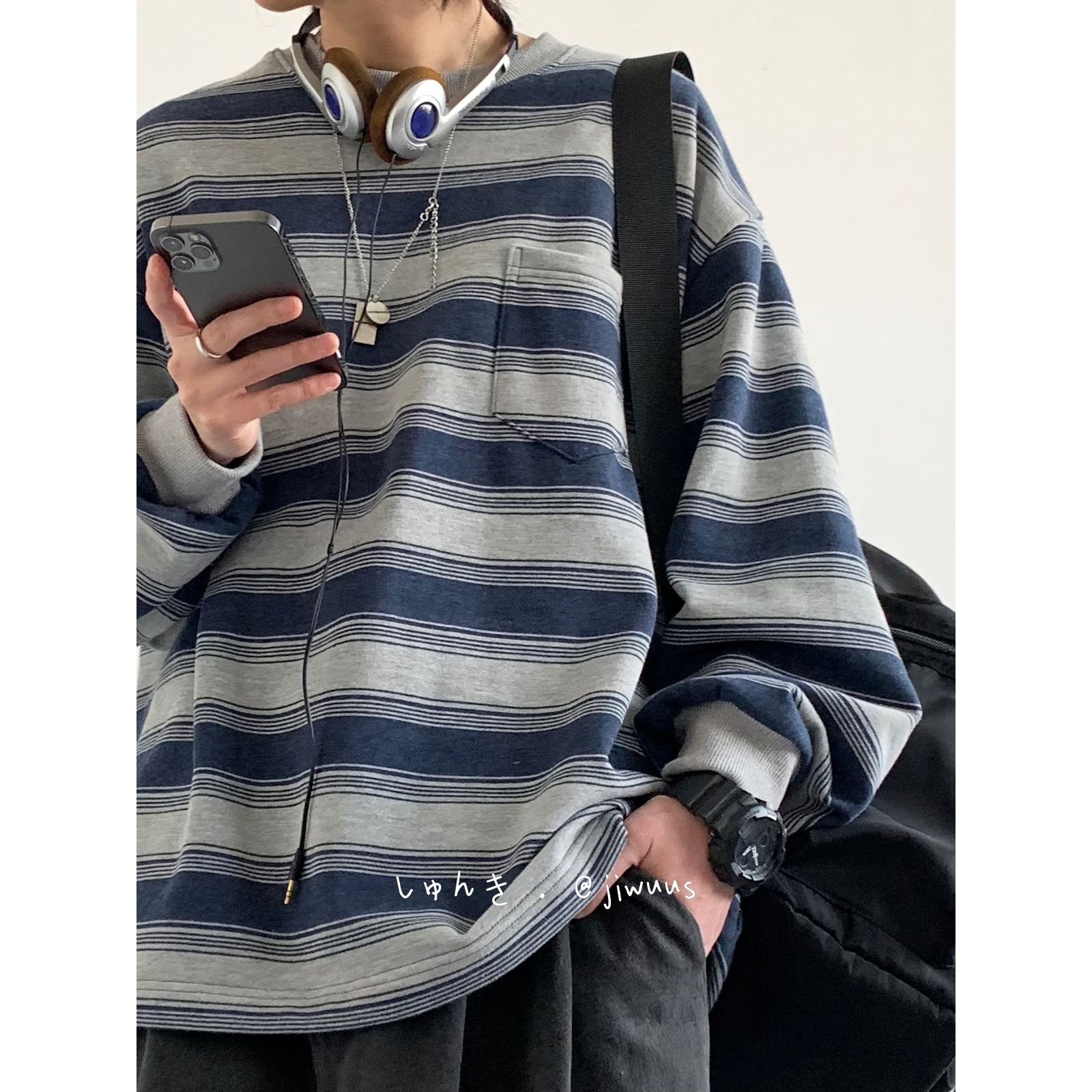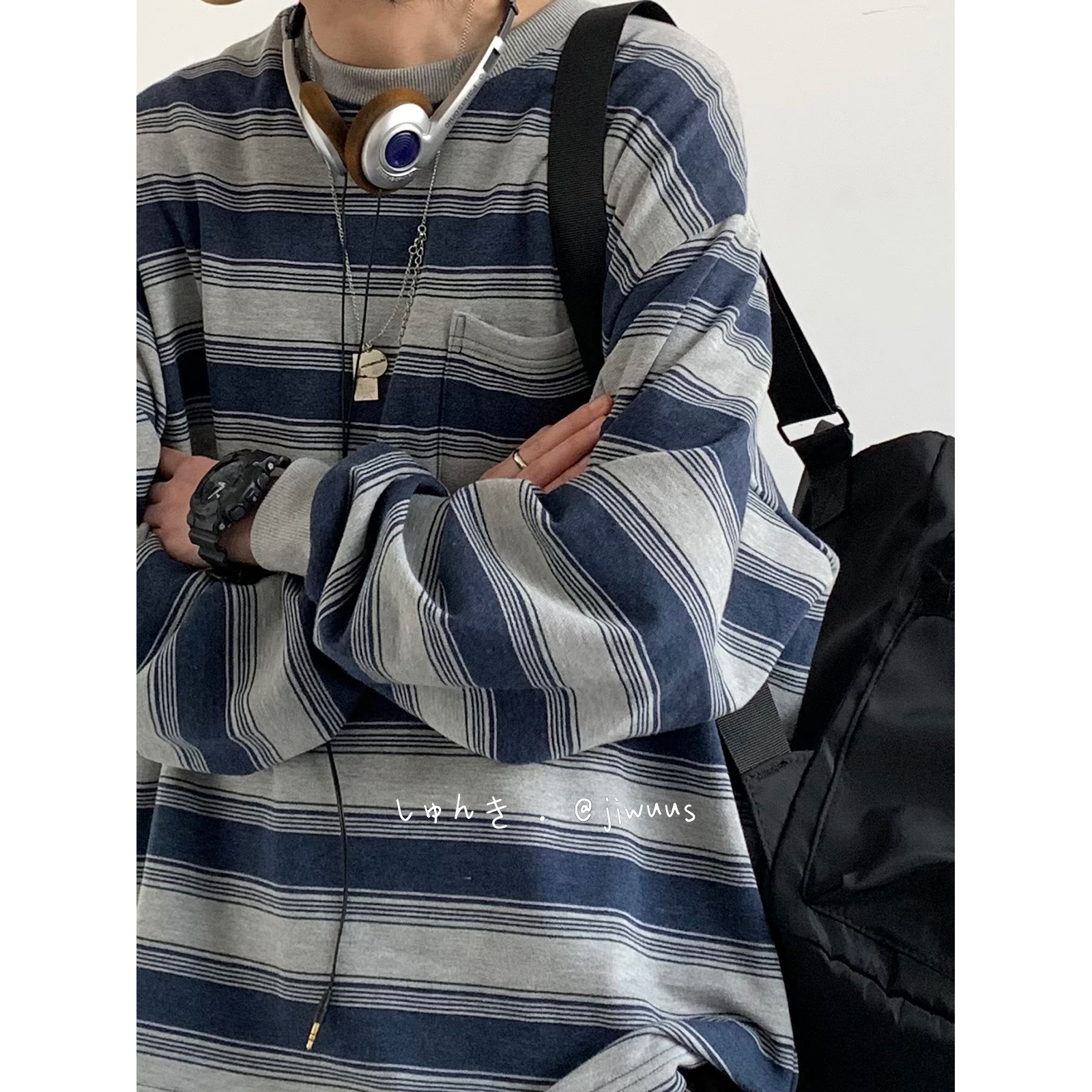 幾物jiwuus 春天日系復古做舊海魂衫男女生情侶圓領條紋工裝衛衣