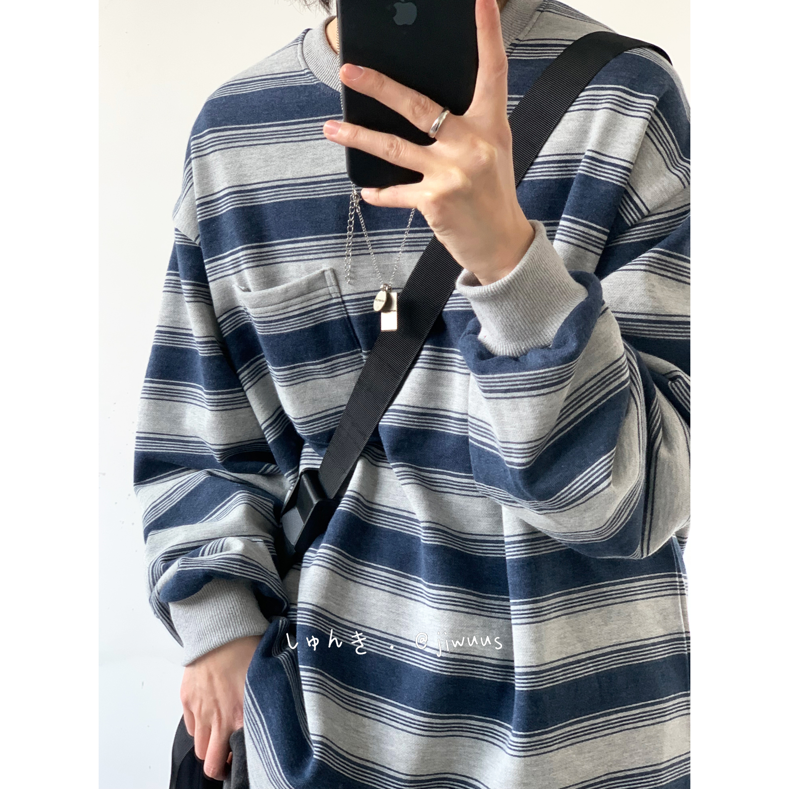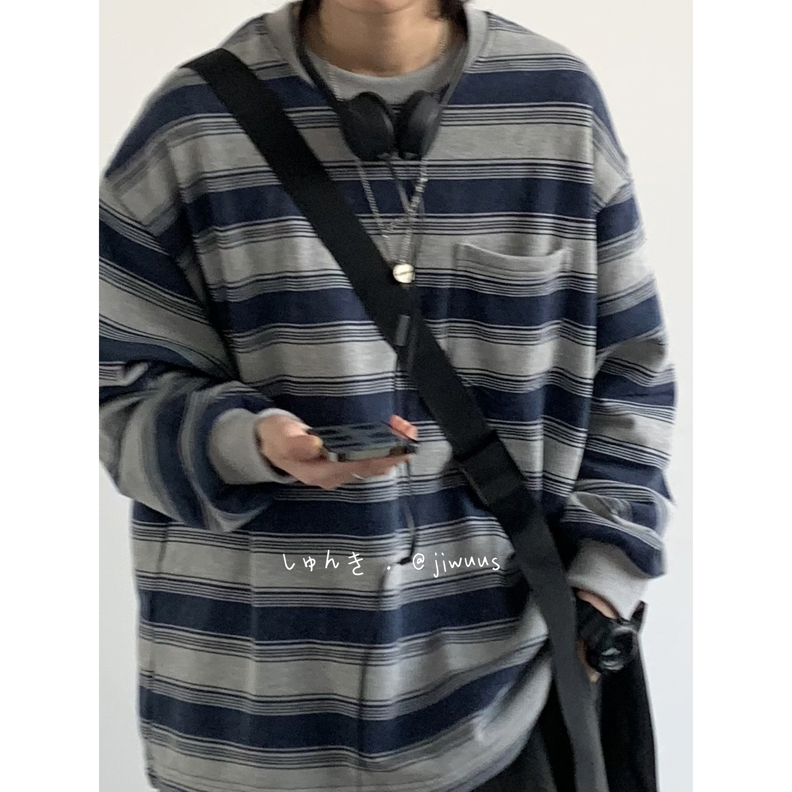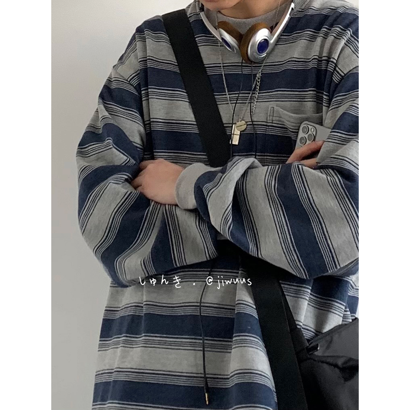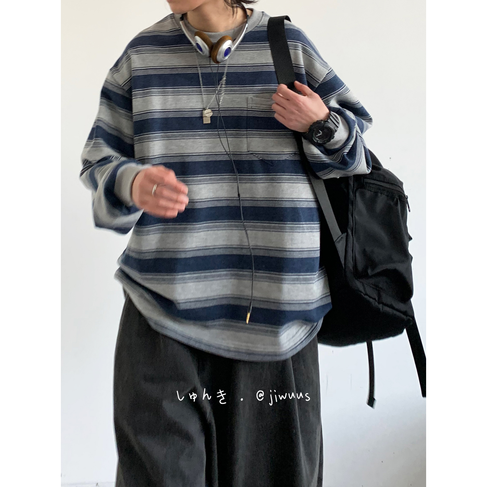 幾物jiwuus 春天日系復古做舊海魂衫男女生情侶圓領條紋工裝衛衣