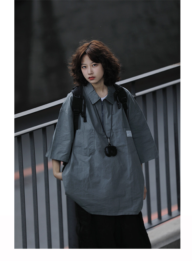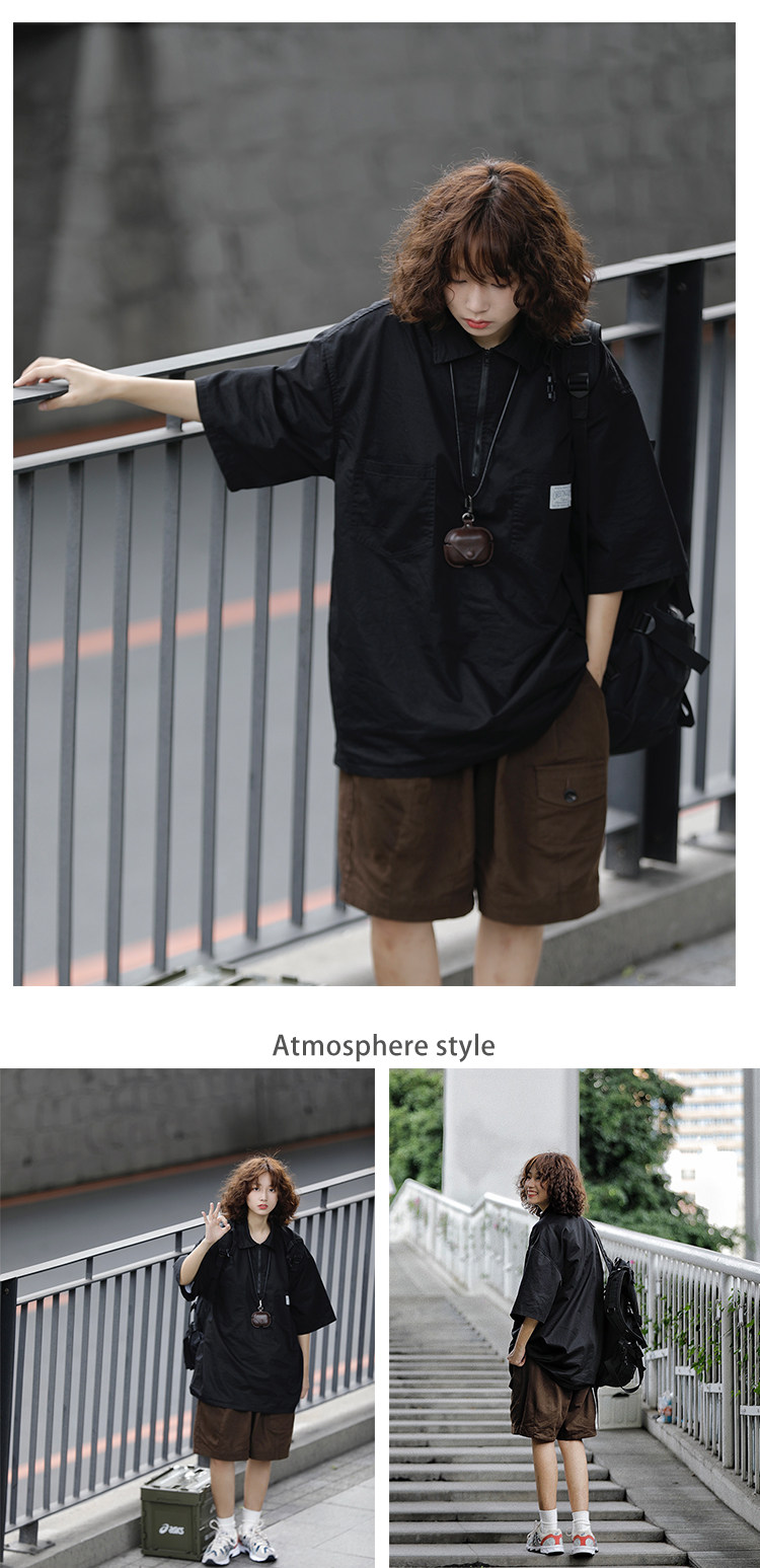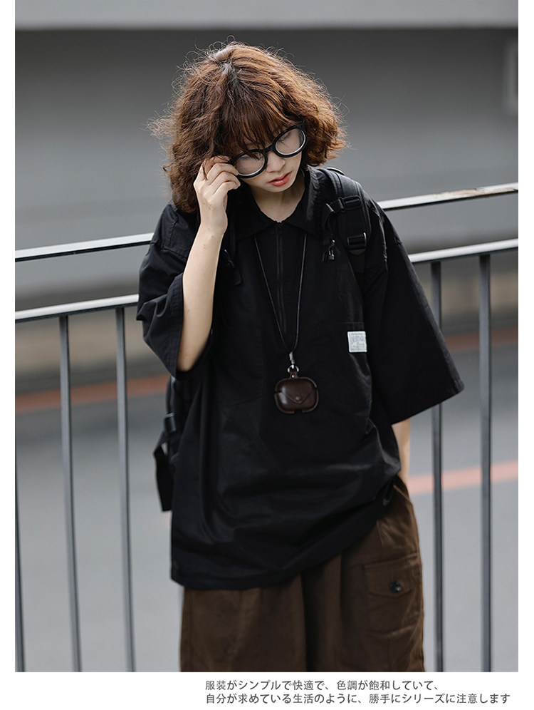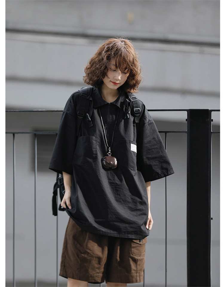 阿於呆 日系寬鬆POLO衫男女休閒百搭純色短袖基礎休閒五分袖上衣
