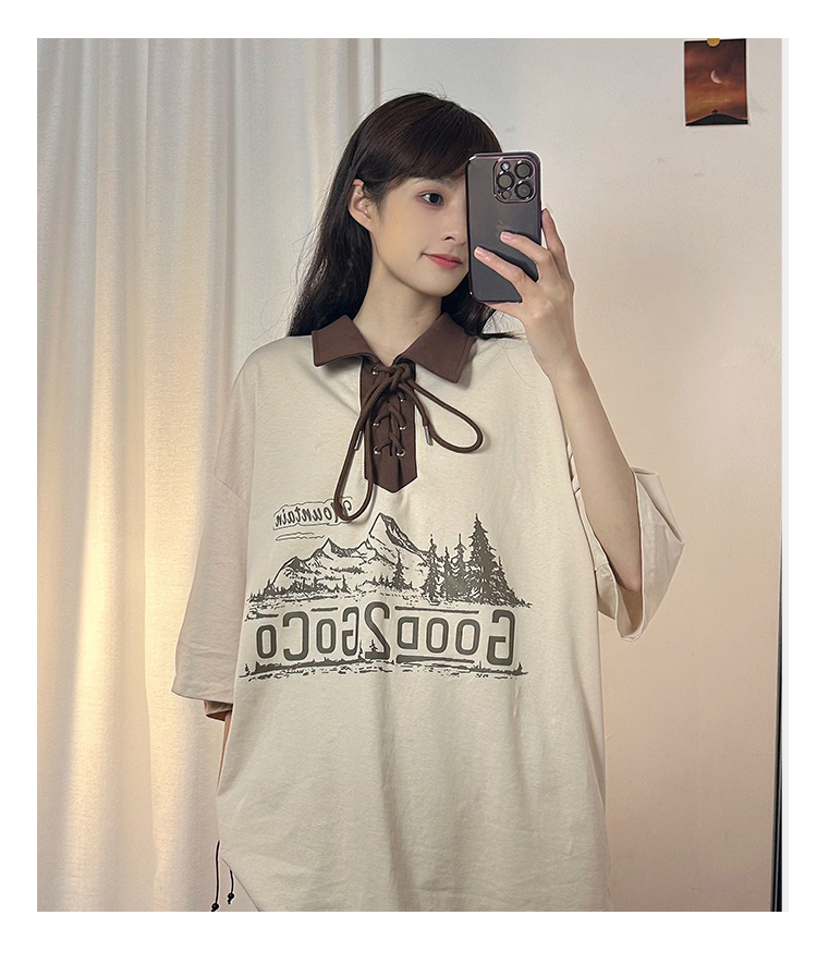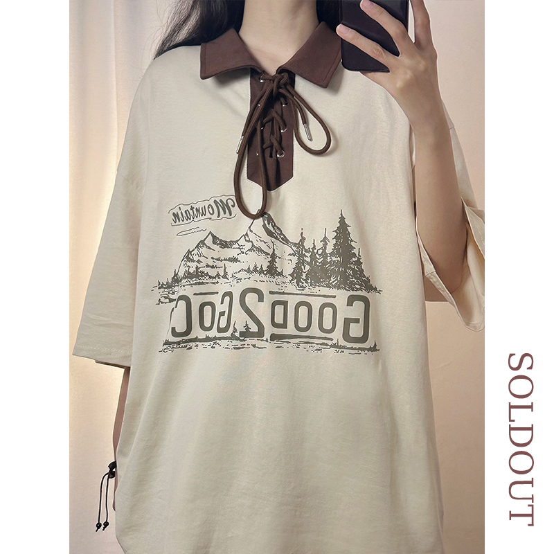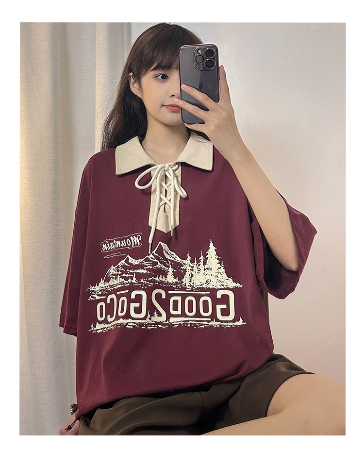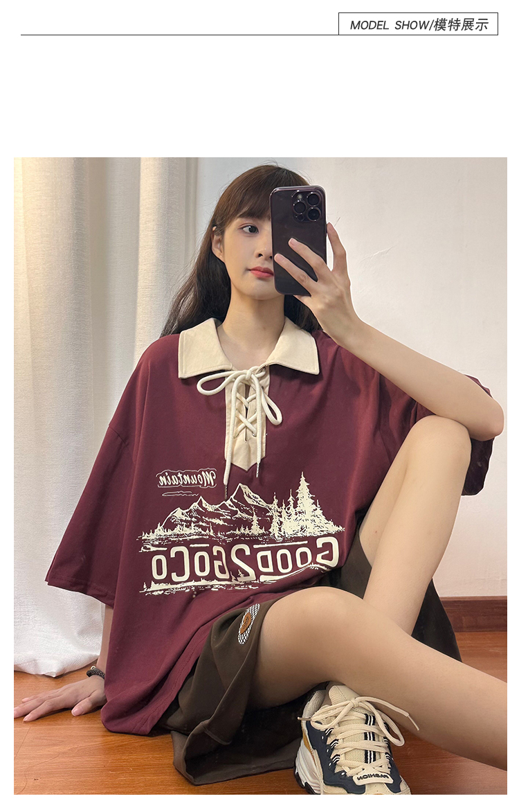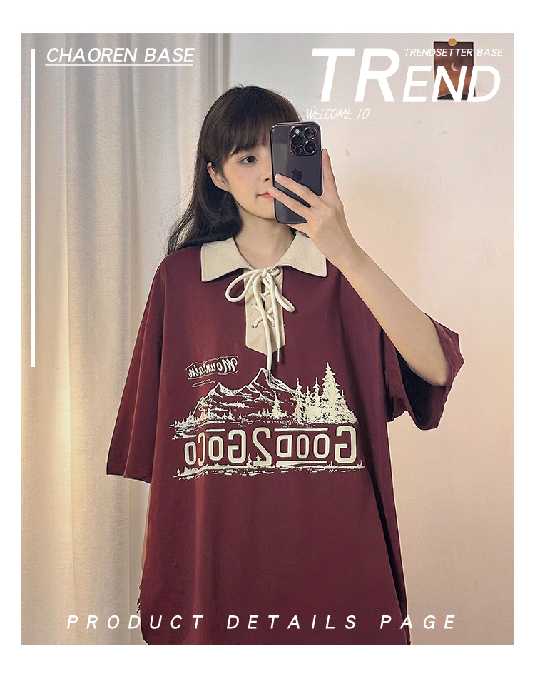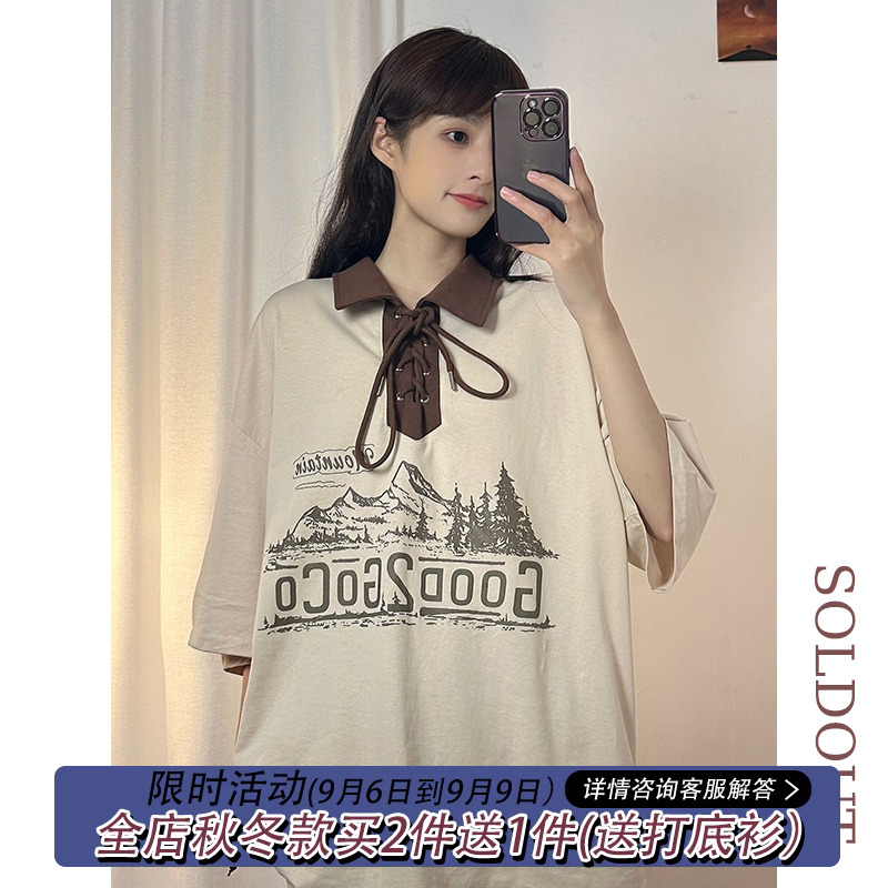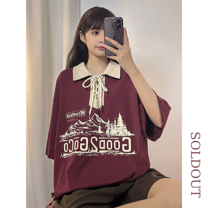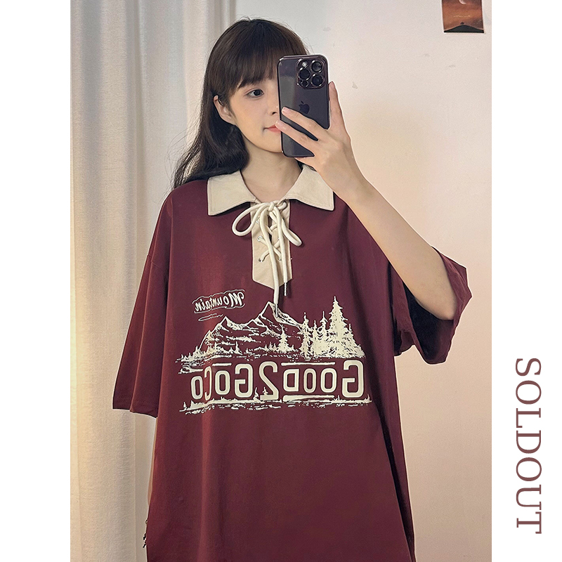 SOLDOUT原創美式復古酒紅色翻領POLO衫短袖T恤女夏寬鬆設計感上衣
