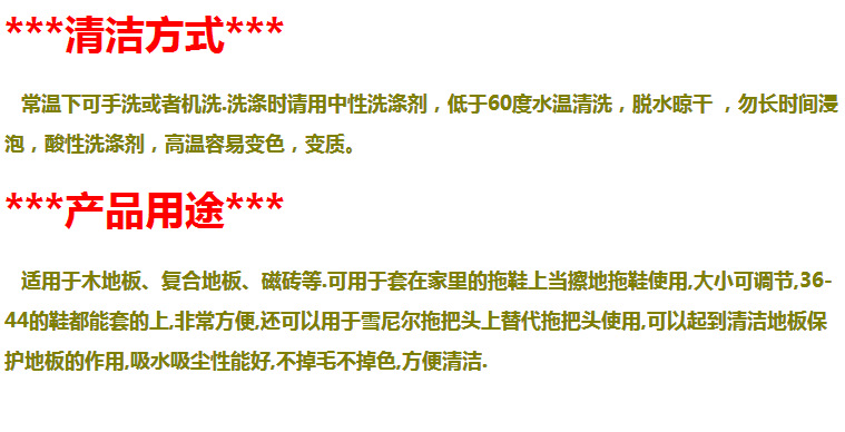 用途:有了这样一双鞋套,擦地板变得好轻松,最大的好处是超级吸尘,对地板没有伤害。