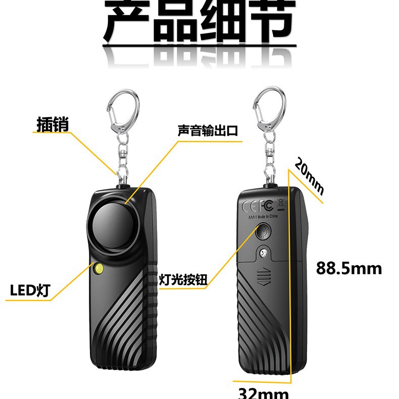 2:报警功能:拔出钥匙扣,产品会发出130dB报警声,同时LED灯闪烁。推回插销,即停止。响亮的报警声可在紧急时刻引起旁人注意,寻求帮助。