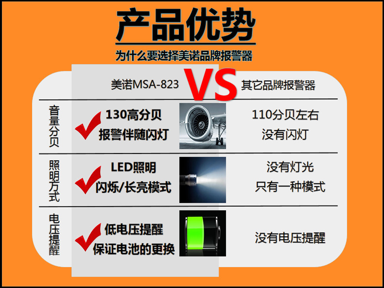 4:低压提醒功能:带低电压指示灯, 待机状态中。当报警器电量过低时,灯光闪烁,需及时更换电池。