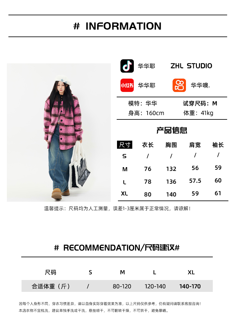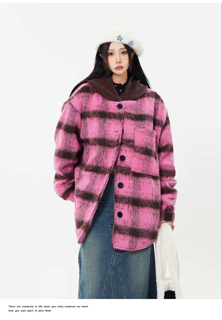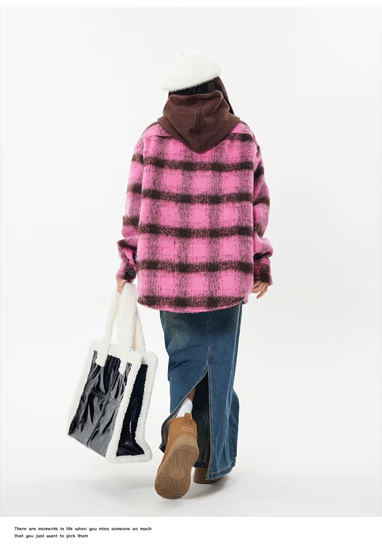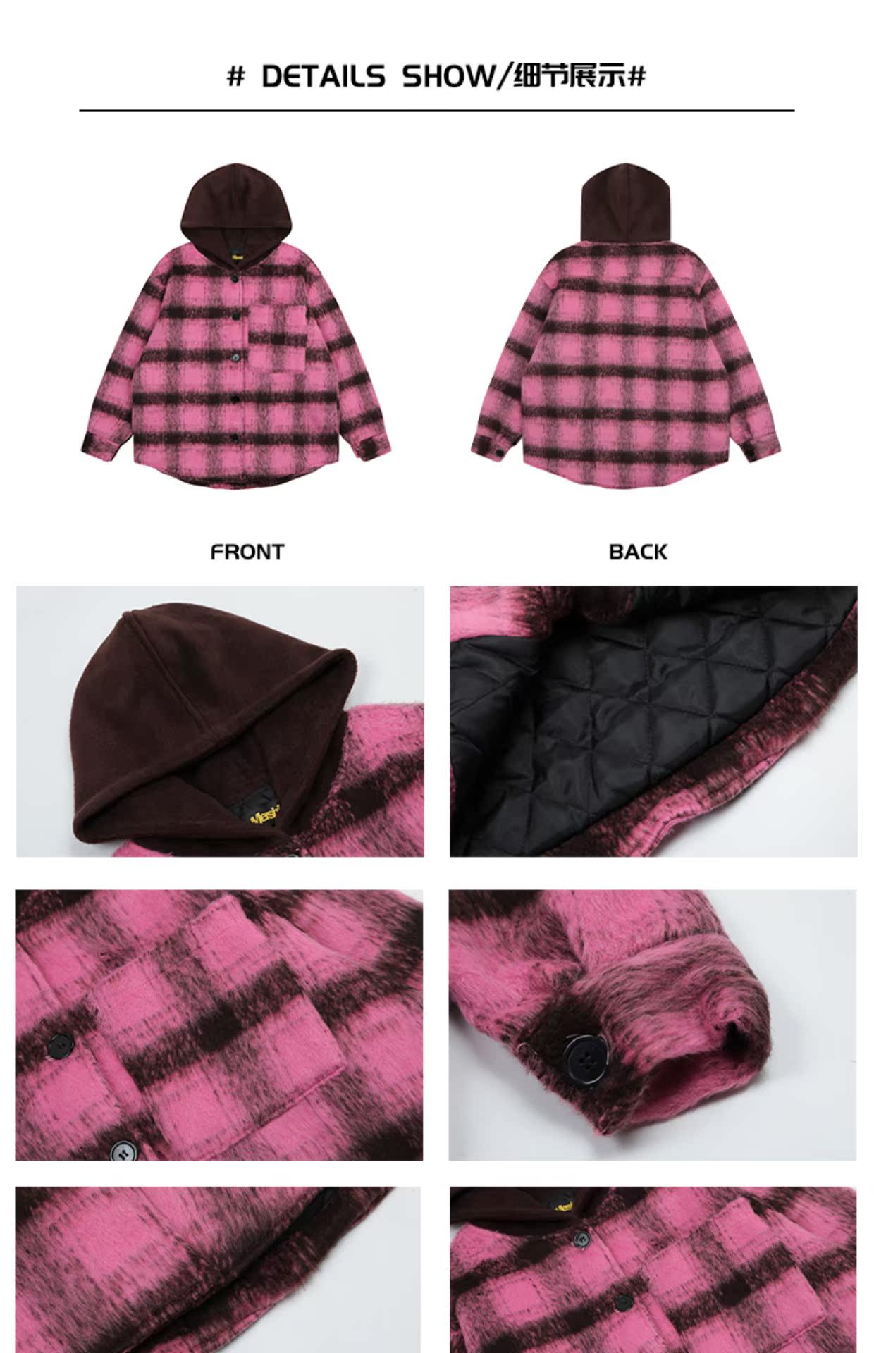 ZHL STUDIO美式復古格子毛呢夾棉保暖外套男女款休閒情侶連帽鋪棉外套