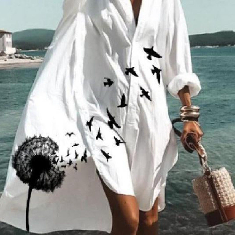 Casual Loose Women Dress歐美寬鬆翻領長袖波西米亞印花洋裝夏