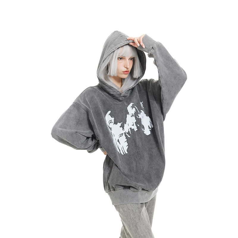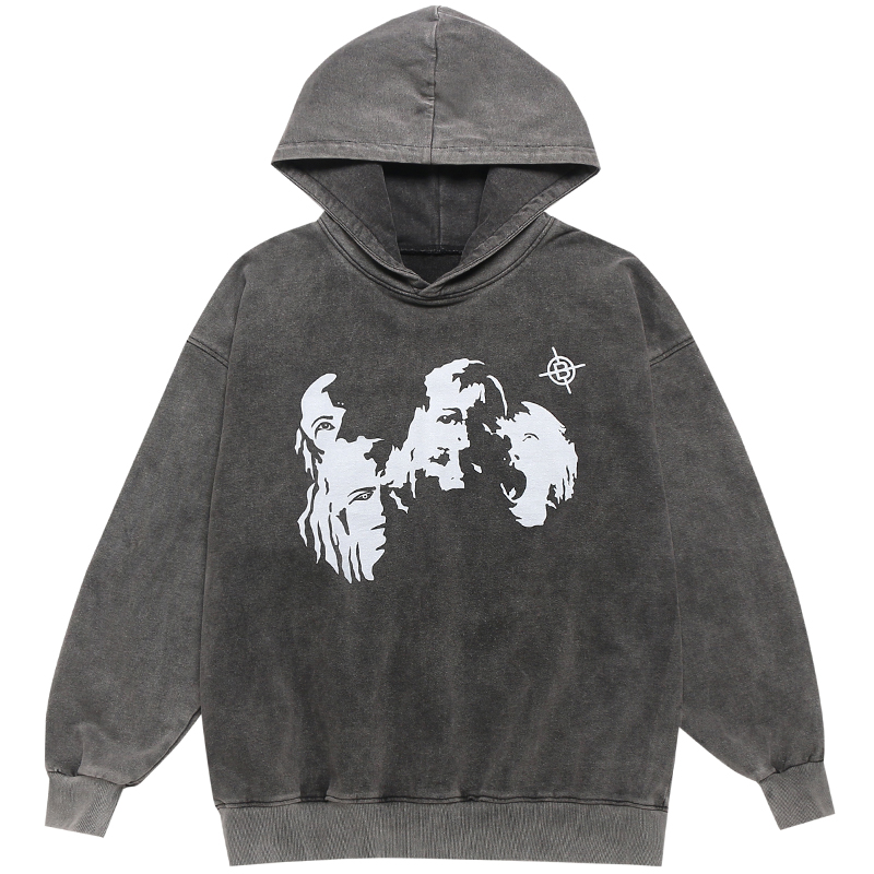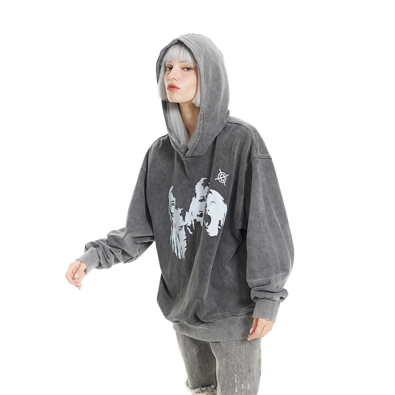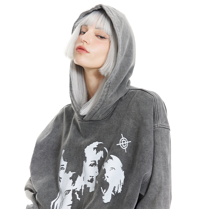 BANDITK GANGN吶喊人像印花厚棉T女秋寬鬆潮牌水洗做舊長袖連帽衫