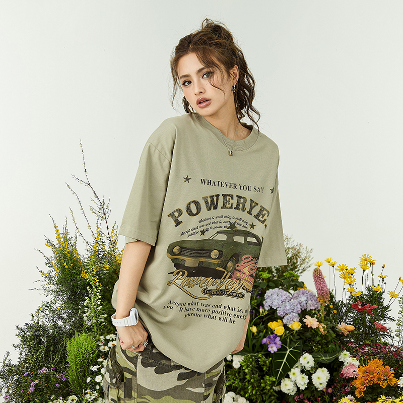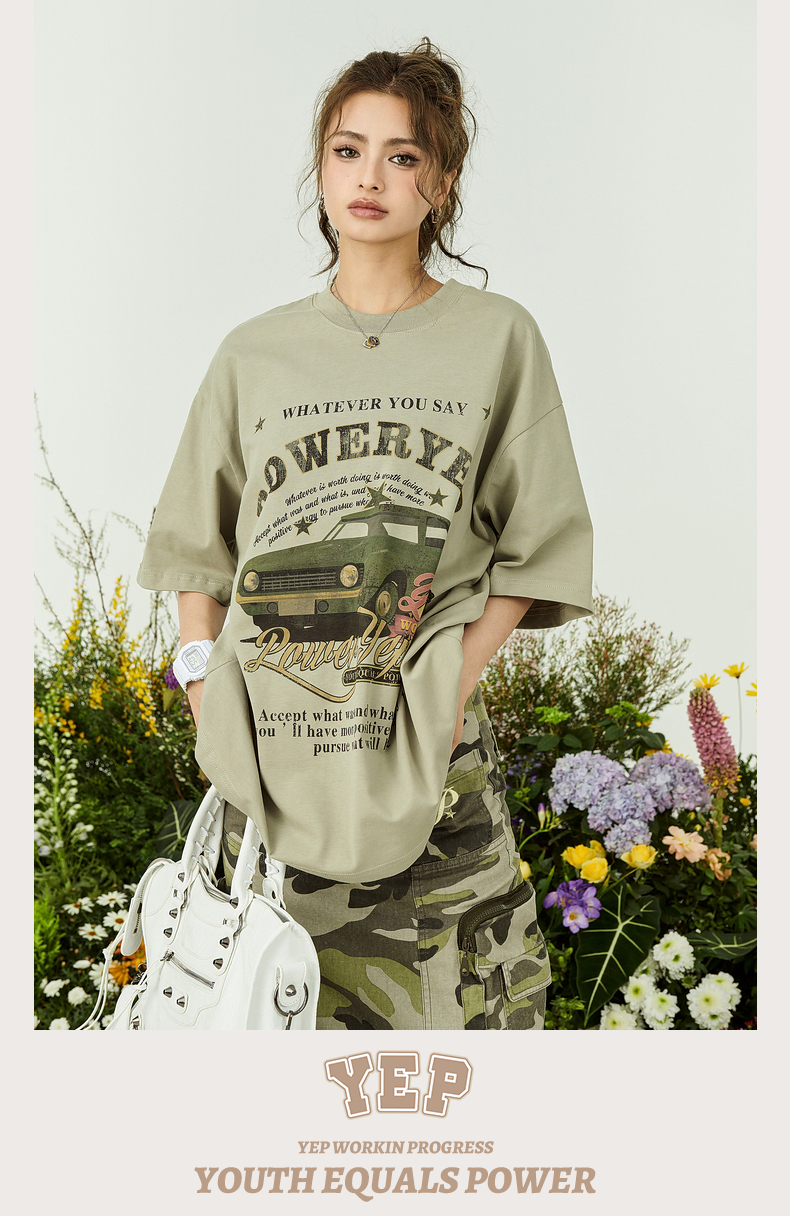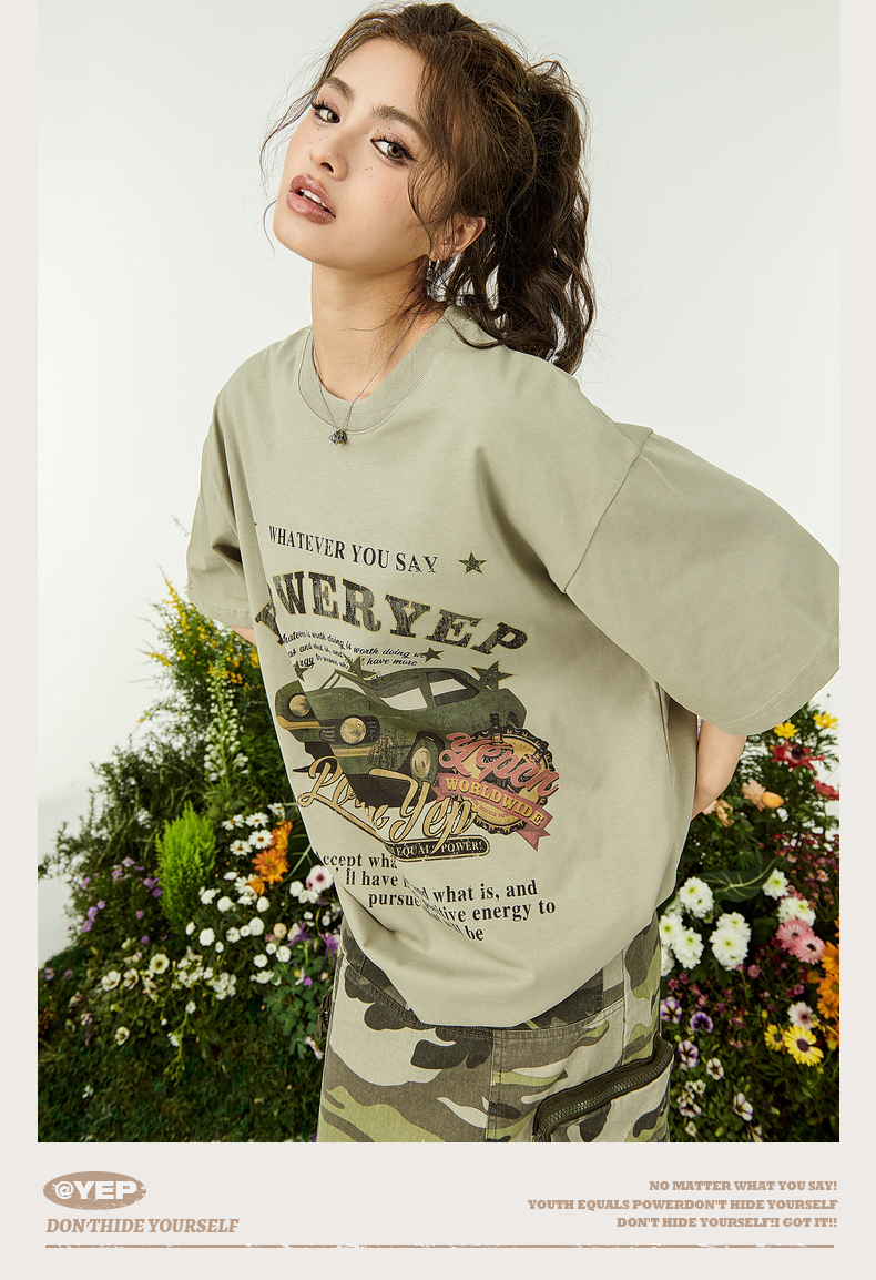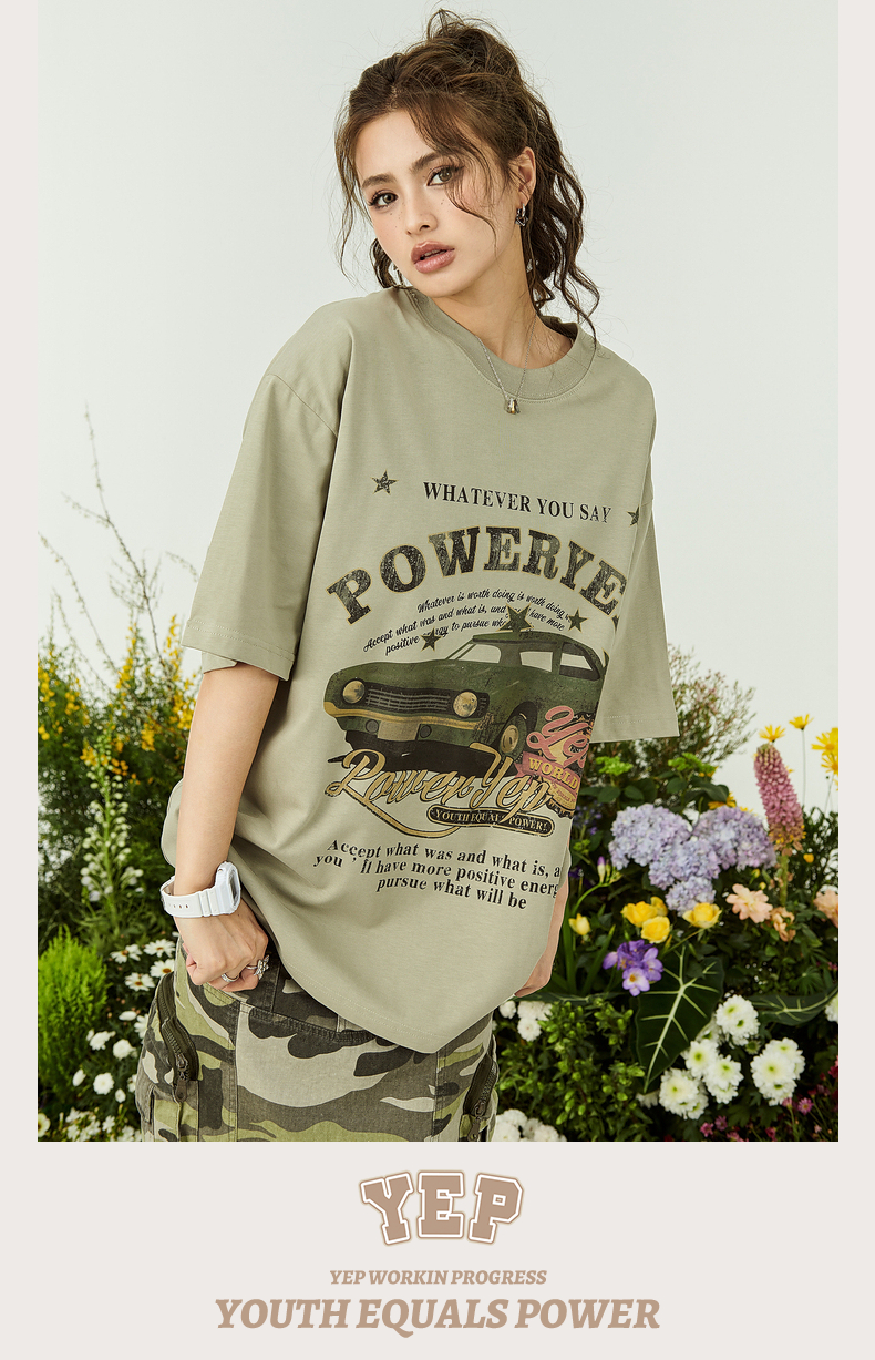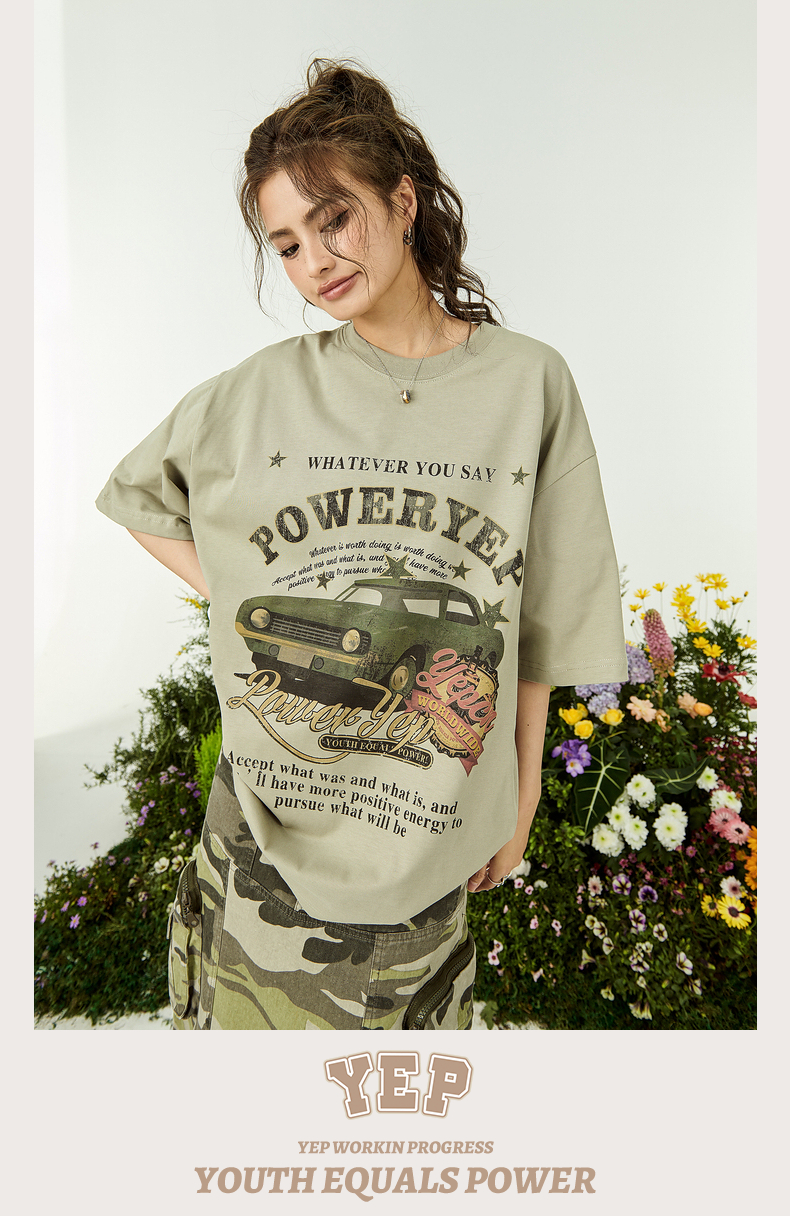 YEP牛油果綠色美式短袖t恤女夏裝2023新款復古汽車印花寬鬆上衣潮