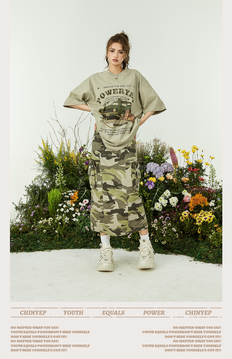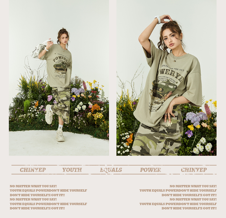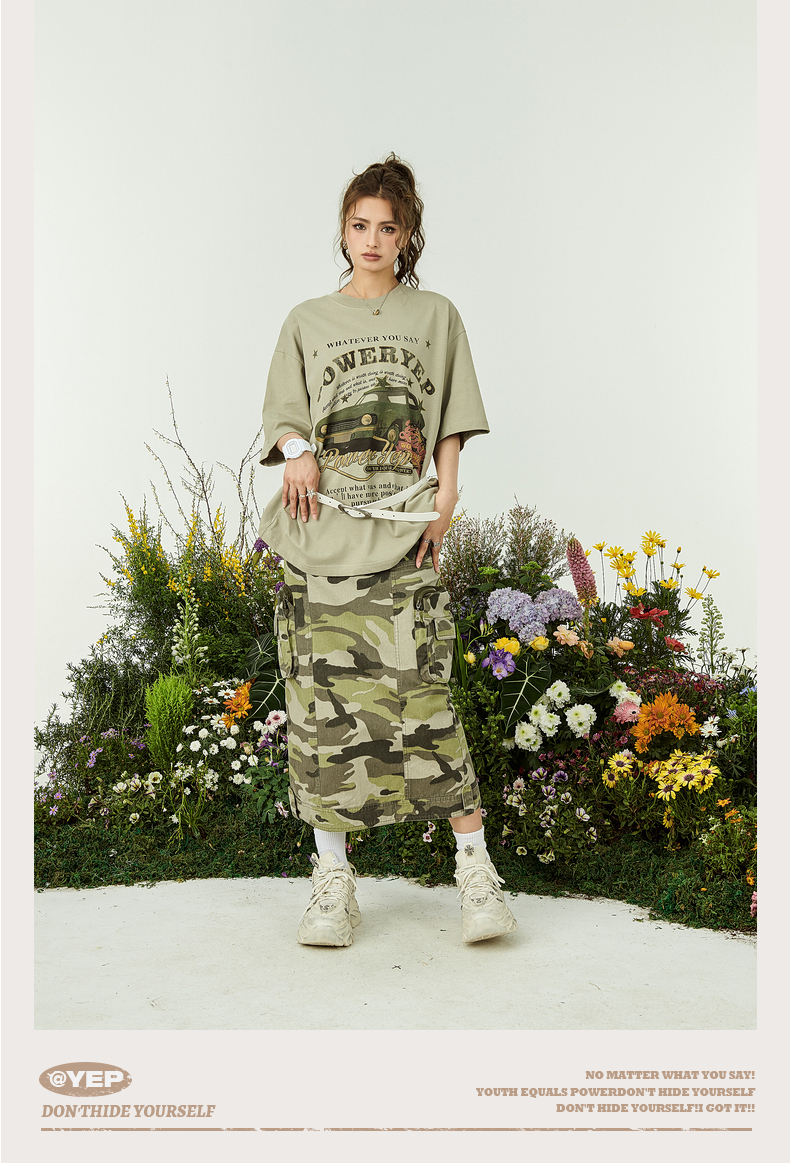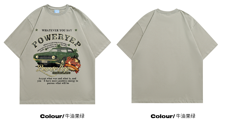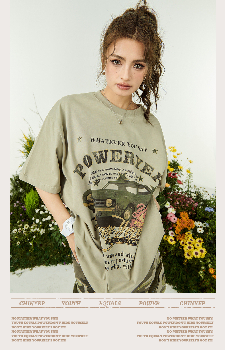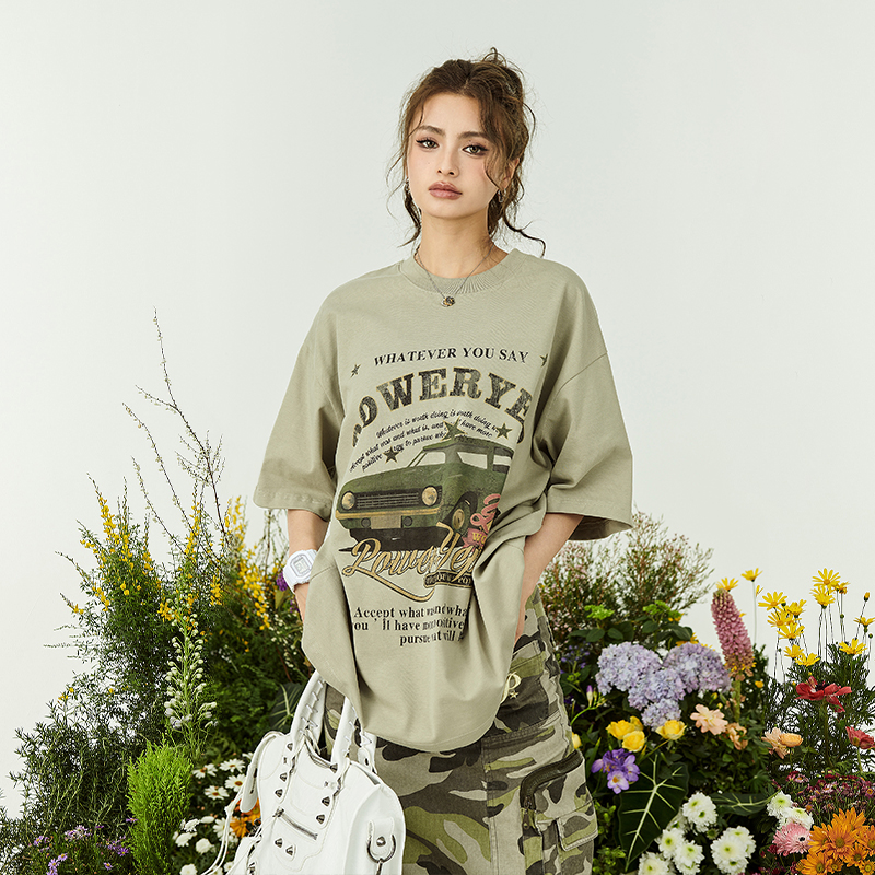YEP牛油果綠色美式短袖t恤女夏裝2023新款復古汽車印花寬鬆上衣潮