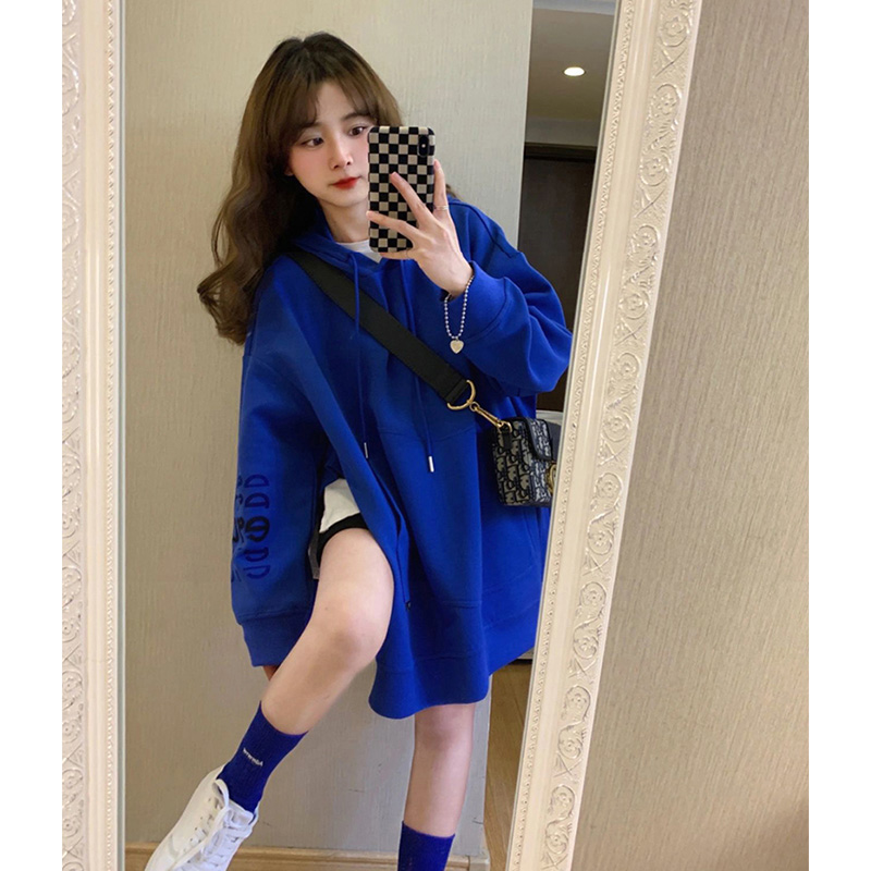 克萊因藍衛衣女獨特設計感春秋別致寬鬆加絨小個子開叉外套潮ins