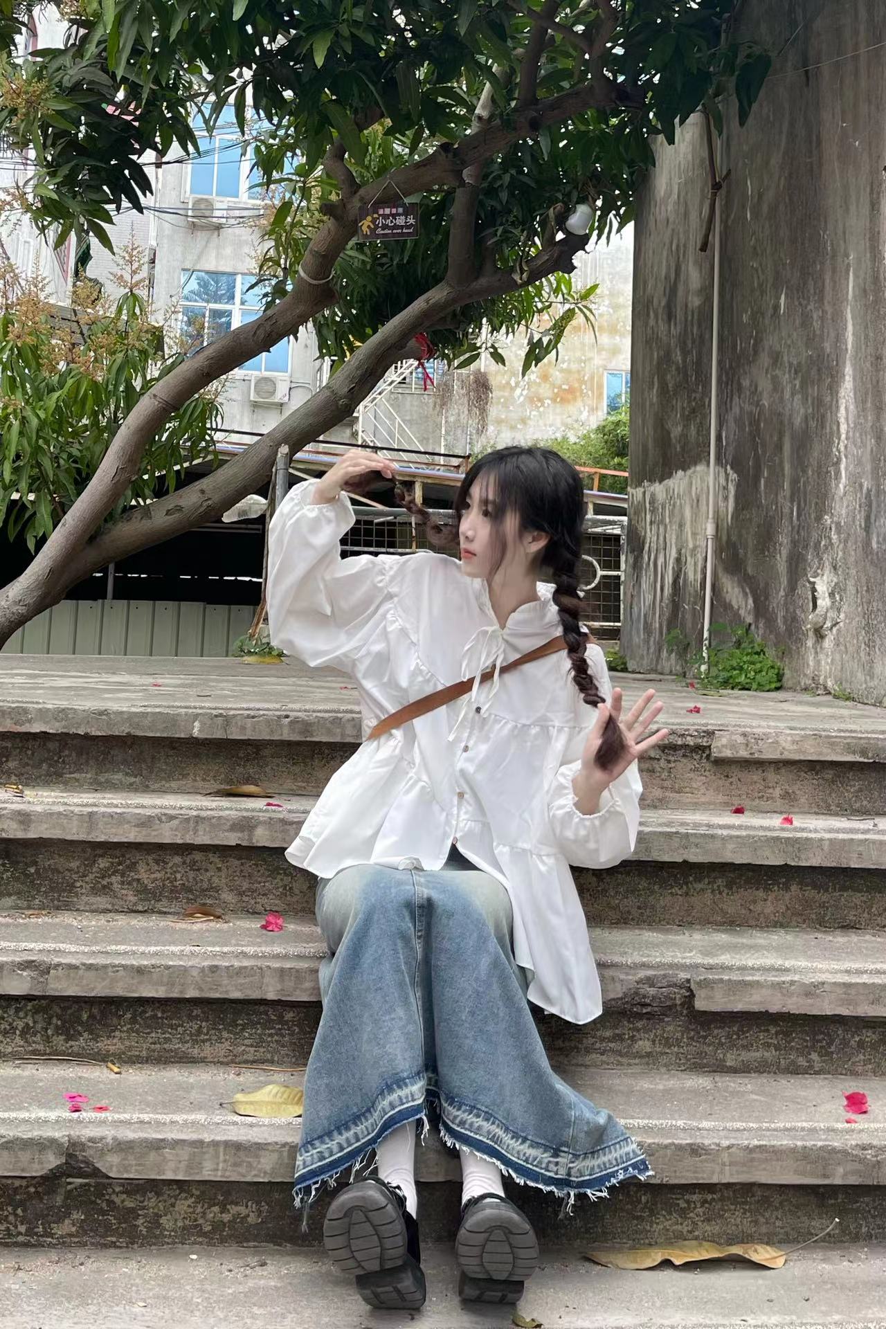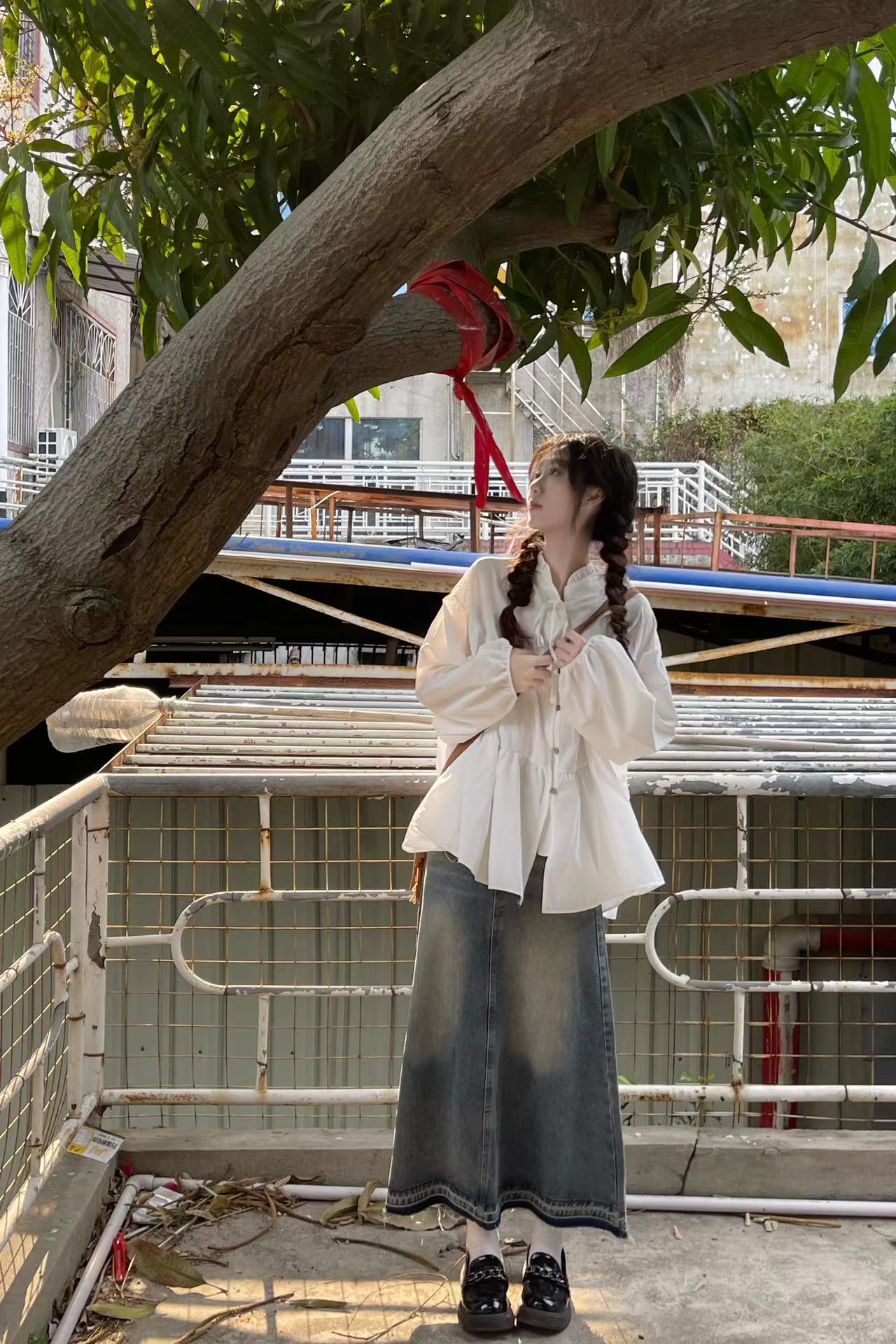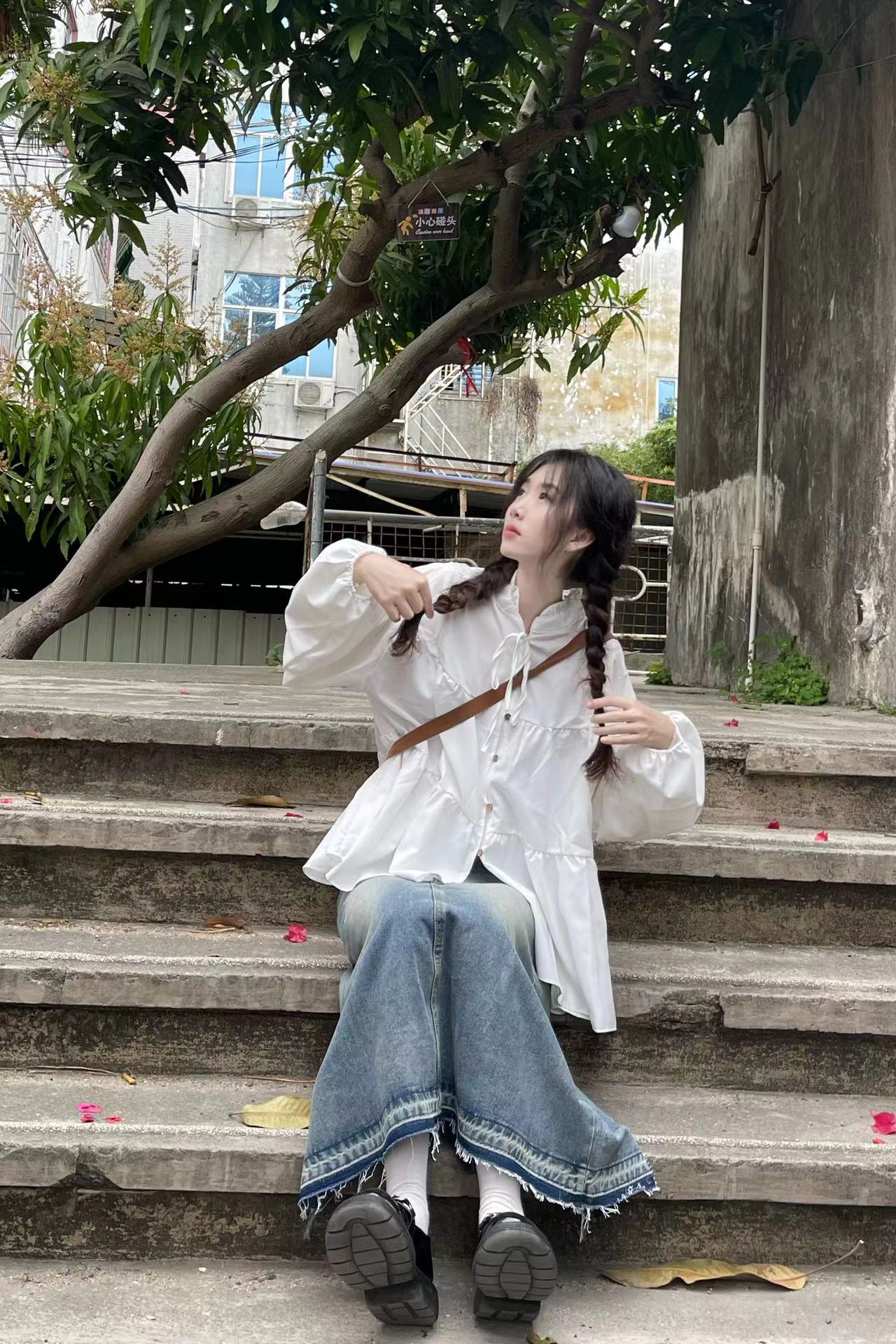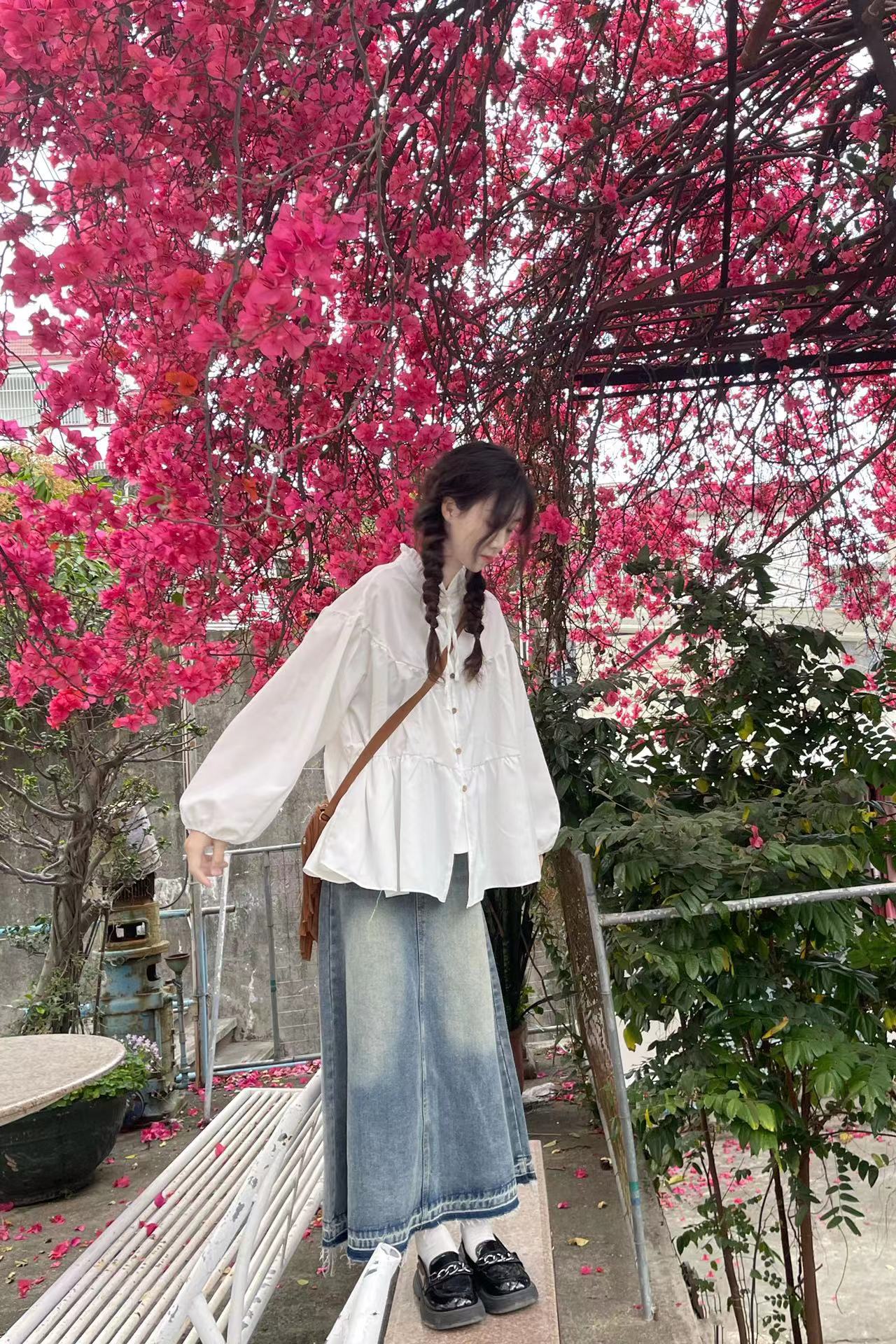 日系溫柔白色系帶鈕釦襯衫小眾設計感森系減齡文藝百搭燈籠袖上衣