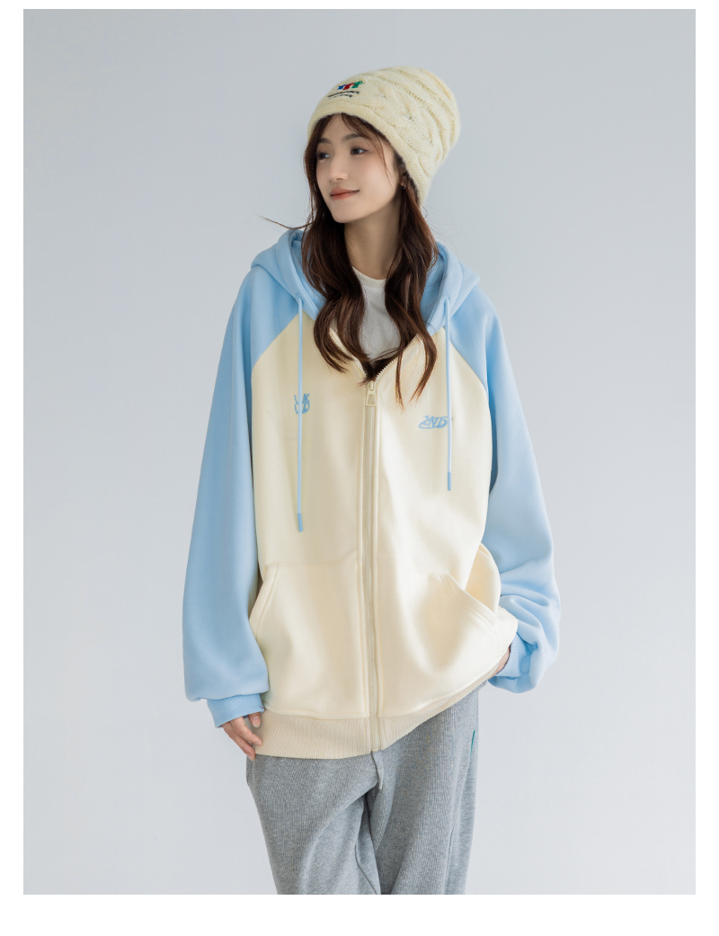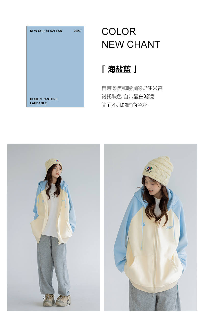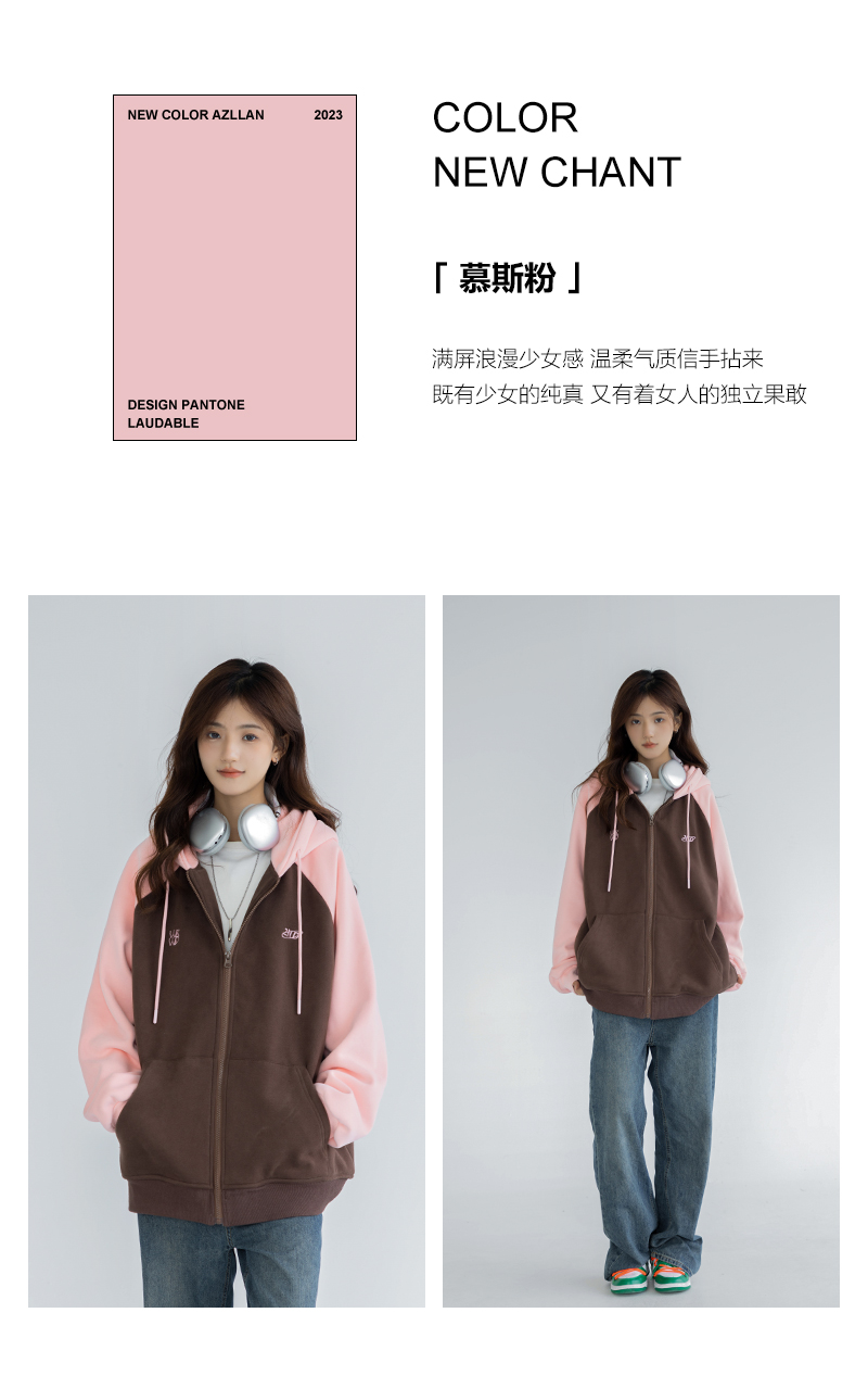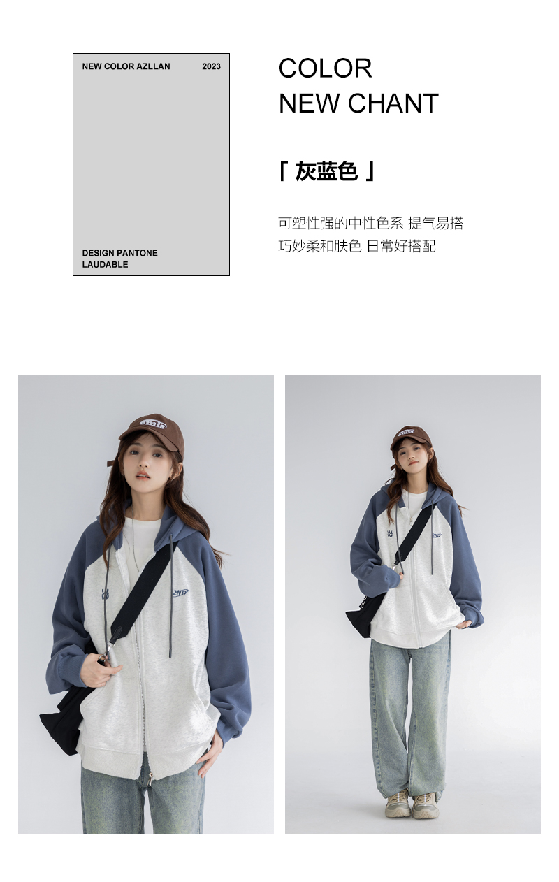 AzLan美式復古插肩袖衛衣開衫女春秋2023新款高級感連帽寬鬆外套