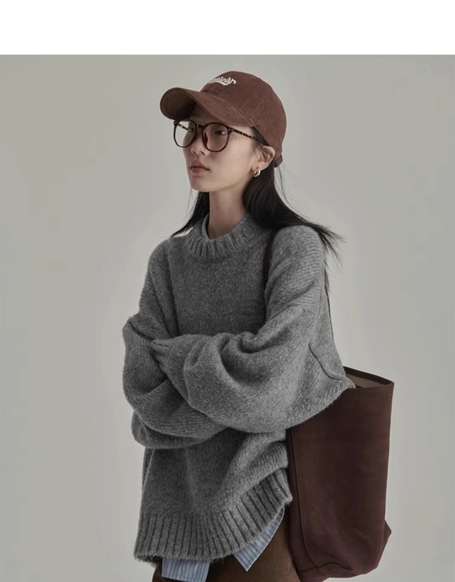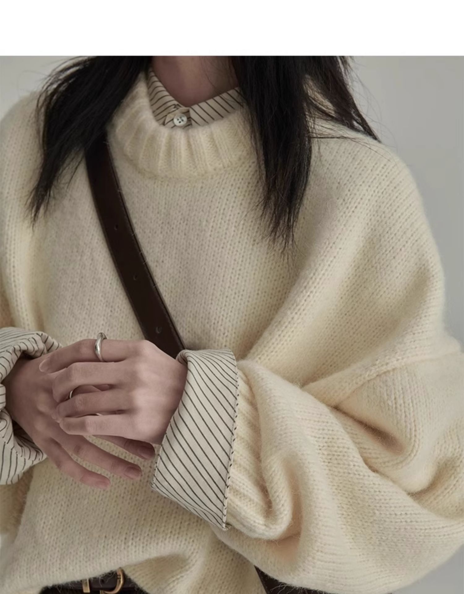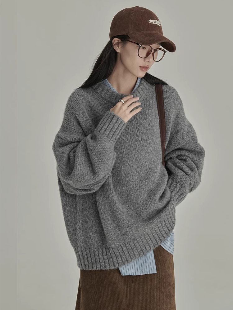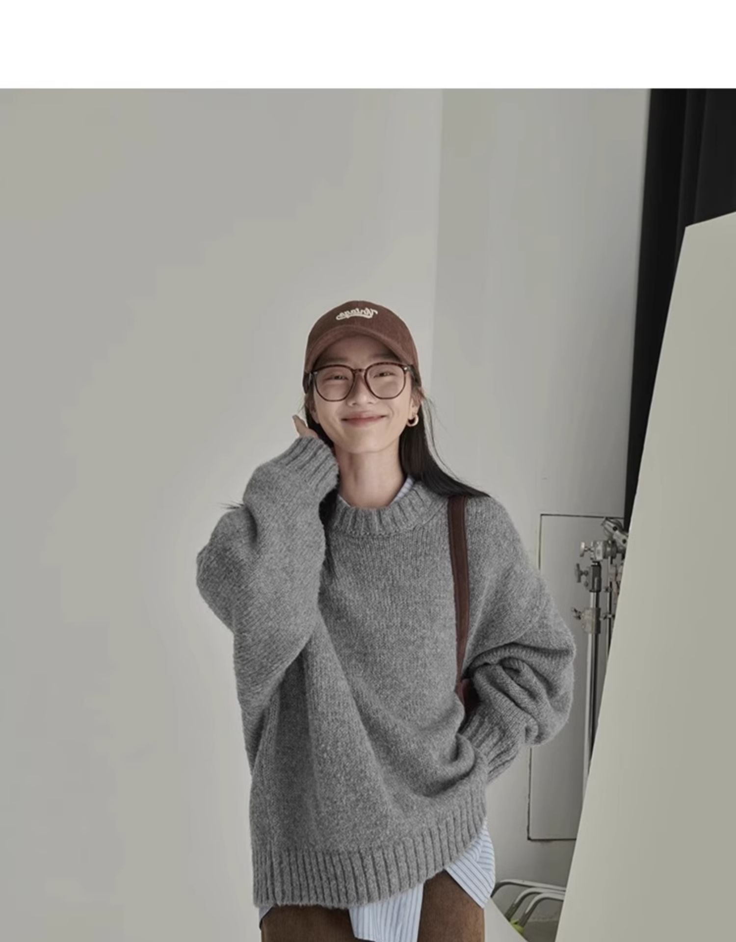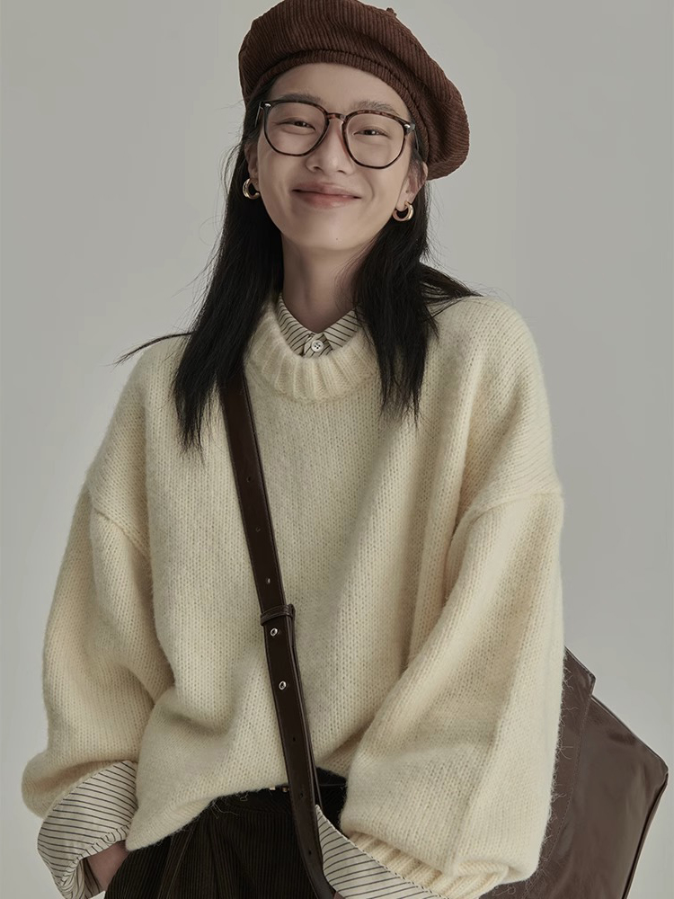 秋冬慵懶風復古圓領套頭寬鬆馬海毛純色外穿內搭打底加厚毛衣女潮