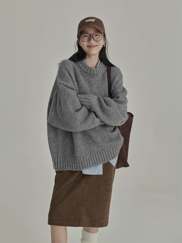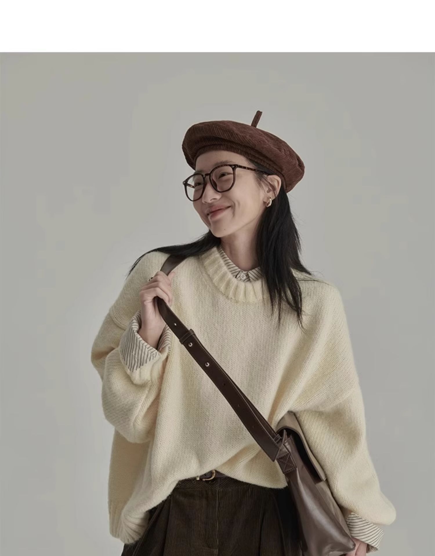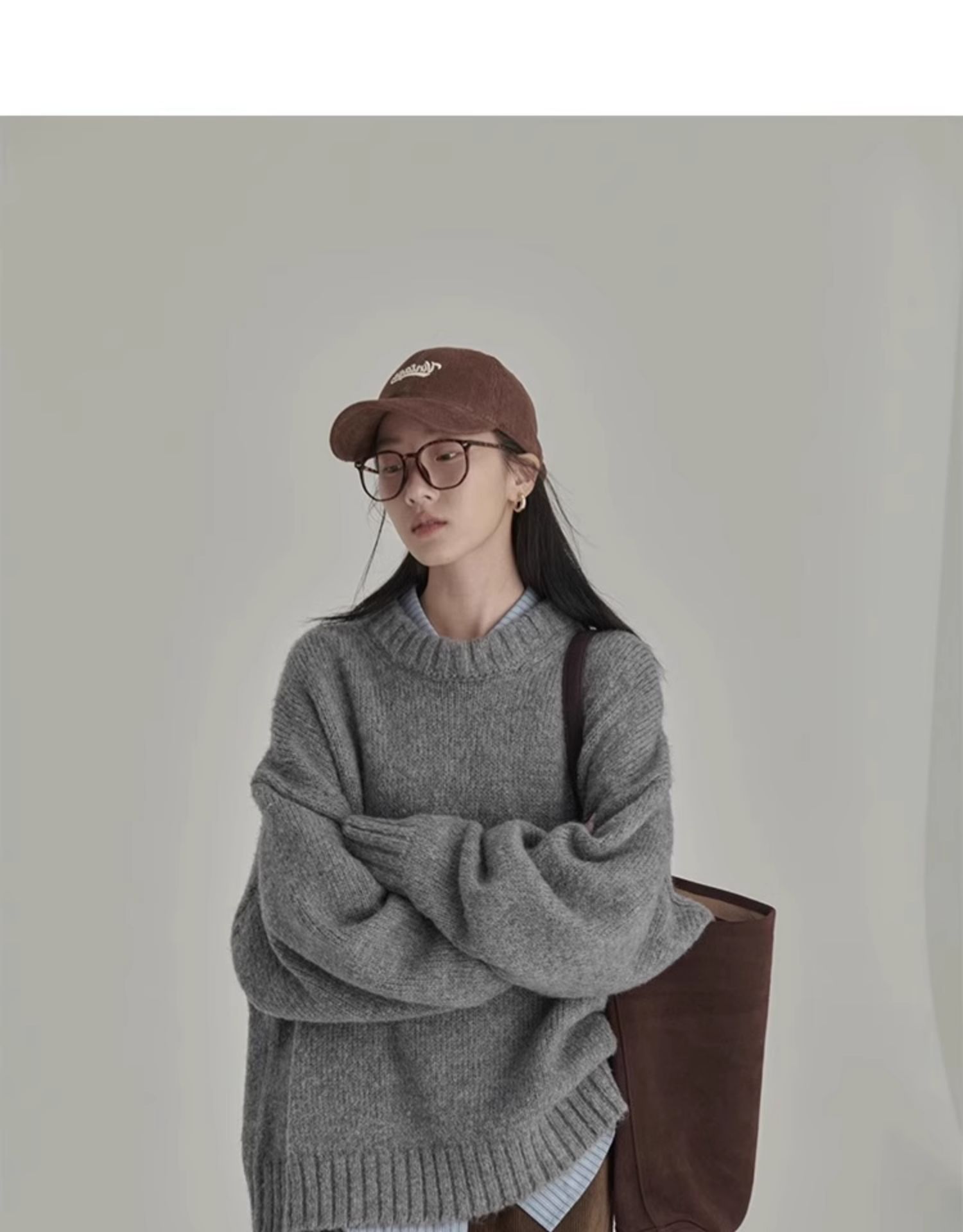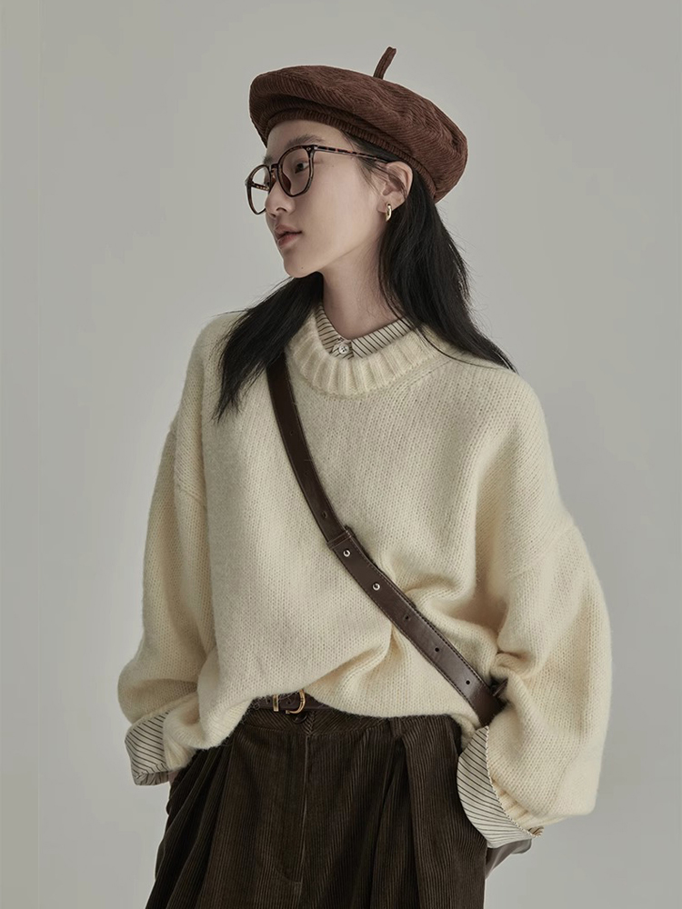 秋冬慵懶風復古圓領套頭寬鬆馬海毛純色外穿內搭打底加厚毛衣女潮