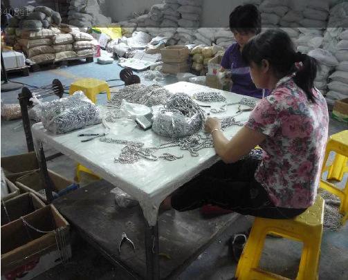 广州市花都区狮岭佳业五金厂零售批发各种口金链条、女式包包、包包链条、箱包五金狗扣、弹簧圈、D扣、五金线圈、万字链、珠链、蛇链,在消费者当中享有较高的地位,公司与多家零售商和代理商建立了长期稳定的合作关系。 1、公司宗旨:“顾客至上、质量保证、出货快捷、价格实惠、服务周到” 2、经营理念:用优质的产品做出客户的口碑。 3、公司优势: 成熟的生产技术; 稳定的员工队伍; 上千的产品种类; 实惠的销售价格; 优质的售后服务。 4、售后服务:本公司提供退货或同类产品换货的服;若发生安装过程的问题,本公司提供免费技术支持服务;其他的未尽事宜均可商量解决。 5、公司门市: 广州市花都区狮岭皮革城四期A五街11号。 6、工厂地址: 广州市花都区狮岭镇联合村自编六群一社三十一巷29号 此外,我们还为广州多家五金、链条商行提供铝链、铁链等胚链(半成品)。 做大做强一直是我们坚持的梦想,将来,更多销售渠道的开展需要您的关注与支持。我们热烈欢迎各界朋友到我们店面或网店来参观、考察、指导以及洽谈业务。 --------------------------------------------- 十二、生产流程 --------------------------------------------- 胚链生产车间 胚链分装区