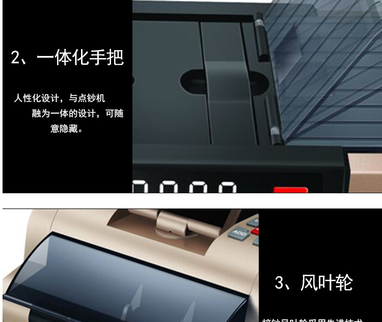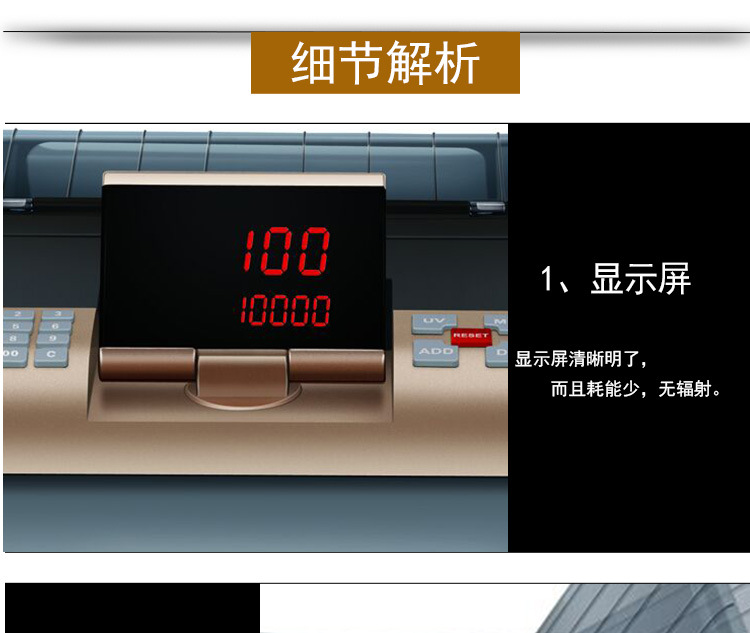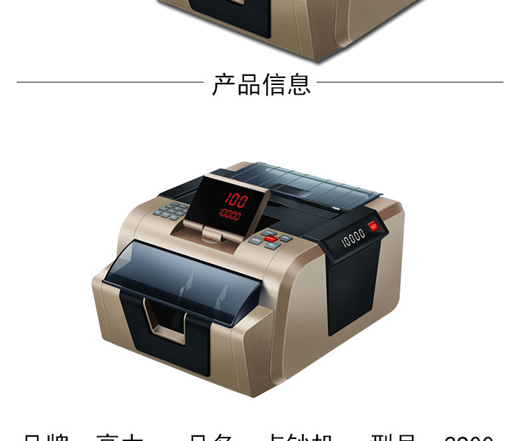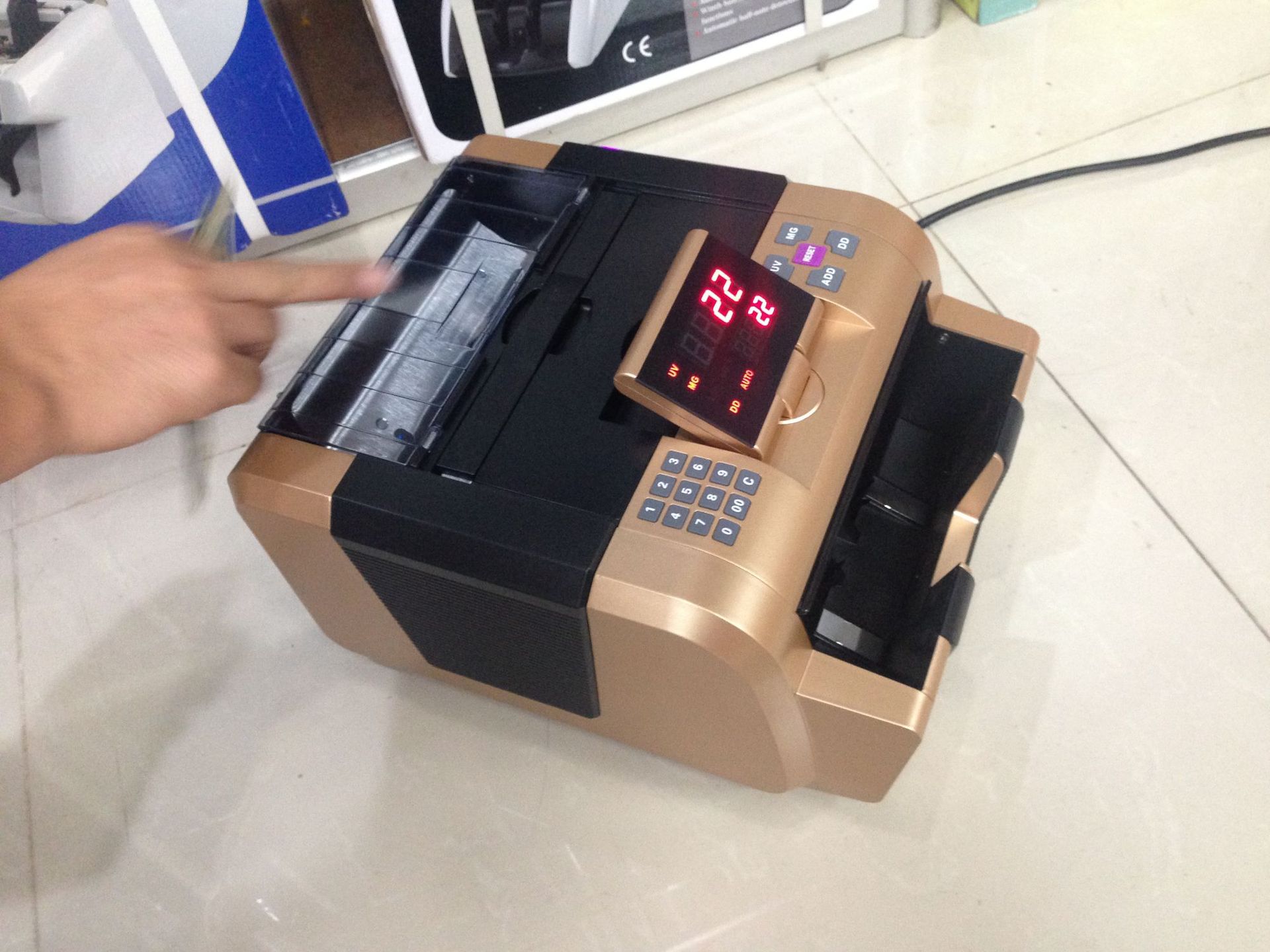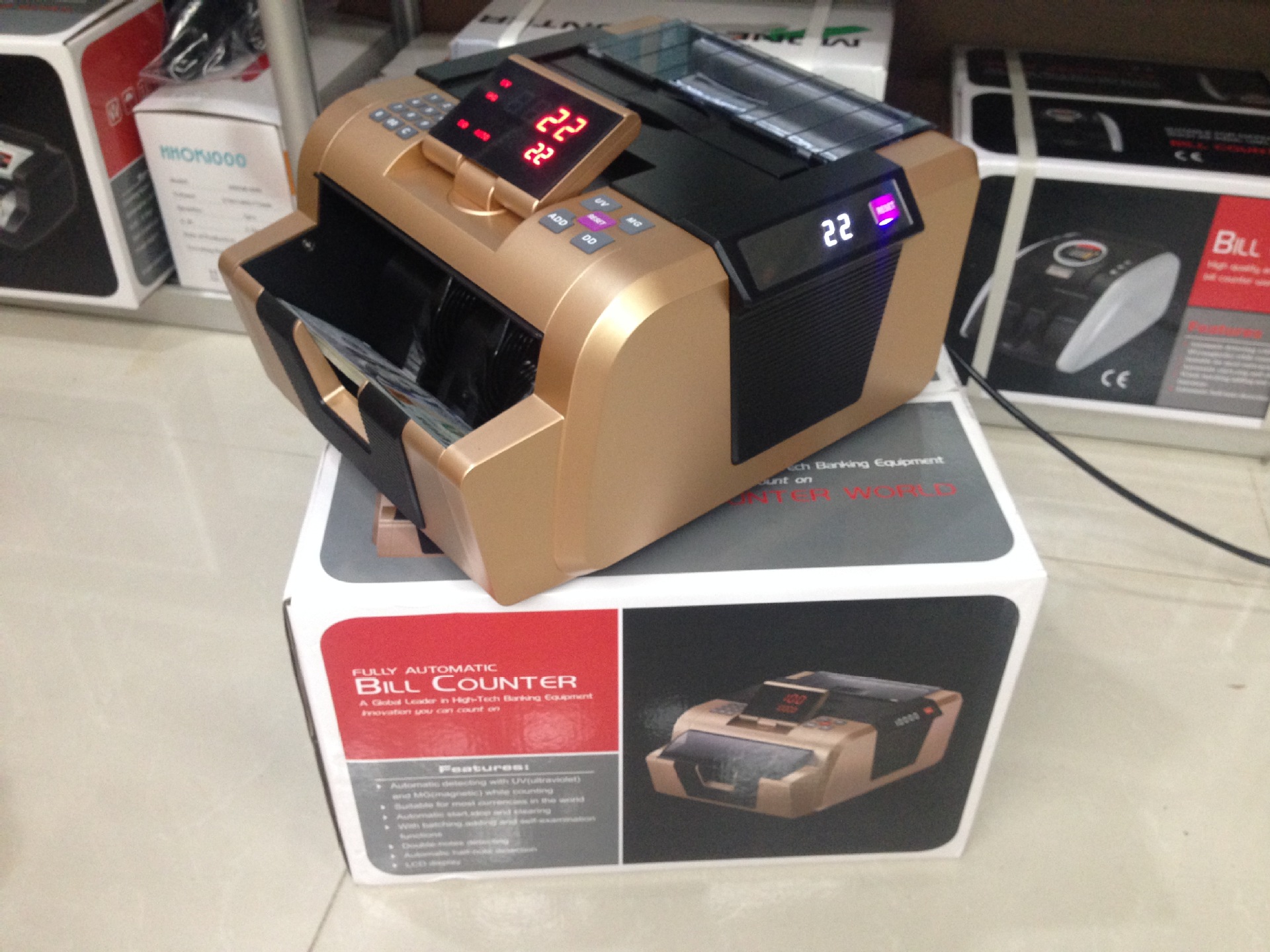 5. Feature and Specification: a). With good quality and nice design, it is a heavy duty backloading money counter. b). It can count and detect all kinds of paper and polymer banknotes in the world. c). UV, MG, IR, DD detecting sensitivity can be adjusted. d). It has self-examination functions. e). Its software can be upgrade f). It has numeric keys, which is more convenient for batch fucntion g). It has 2 dust covers h). Counting Speed: >1,000pcs/min i). Hopper’s Size: 190mm j). Money counter’s size: 320mm x 270mm x 175mm k). Display Screen: Main display screen is LED. Side display screen is LCD(Lens). Main display screen can be rotated for 360 degree. l). Gross Weight: 15.5kgs (2pcs) m). Size of Carton: 640mm x 385mm x 255mm (2pcs) n). Hopper Capacity: 300pcs o). Stacker Capacity: 200pcs p). Voltage and Frequency: 220V, 50Hz or 110V, 60Hz