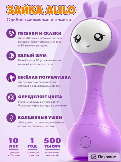 Описание: Меня зовут Умный Зайка alilo, и я незаменимый помощник для мам и интересный, лучший друг для малышей. Я знаю наизусть 30 замечательных песенок. Со мной не заскучаешь! Я знаю 25 добрых сказок и расскажу их голосами настоящих актрис театра. 45 минут белого шума помогут малышу успокоиться и быстро уснуть. Вместе с малышом мы разучим забавные стишки и потешки. Я знаю 9 цветов и произношу их названия на русском и английском языках. Интересная развивающая игра, которая понравится детям. 9 карточек в комплекте! Познакомлю ребёнка с целым миром звуков. Тряси меня как погремушку и мы вместе узнаем, как говорят животные, звучат музыкальные инструменты, какие бывают звуки в природе! Мои волшебные ушки сделаны из мягкого и безопасного силикона и переливаются в темноте разными цветами. Но я не просто ночник, мои мягкие ушки можно грызть. Мне не нужны батарейки. Гарантия 1 год! Интерактивная и музыкальная игрушка зайка alilo r1 (алило р1) - лучший подарок для малышей, в том числе для новорожденных.