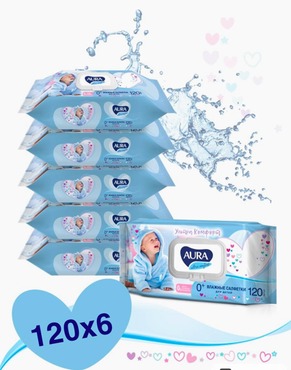 Aura Влажные салфетки детские 0+, Алоэ и витамин Е, 720 шт(6х120)