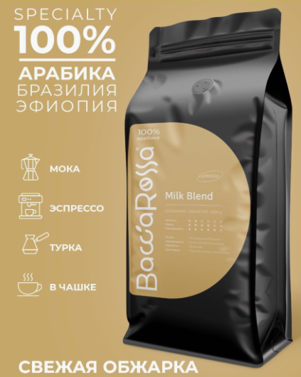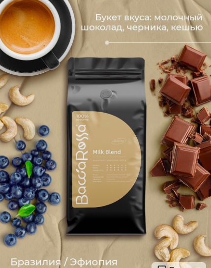 Описание: Свежеобжаренный кофе в зернах бережно доставляем на пике вкуса для любителей спешелти кофе средней обжарки. 100% арабика высшей категории - мы отобрали премиальные сорта с плантаций мира. Милк Бленд Bacca Rossa - это смесь Бразилия Моджиана и Эфиопия Иргачеффе с насыщенным ароматом и плотной бархатной текстурой. В Милк Бленд усилены сладкие ореховые и ягодные оттенки вкуса. Яркий и сочный эспрессо в сочетании с молоком раскрывается новыми нотами и делает капучино, латте, раф особенно сладкими, сохраняя сбалансированность вкуса. Натуральный specialty кофе обладает утонченным ароматом миндаля, темных ягод и медовыми оттенками. Свежезаваренный кофе имеет во вкусе нотку молочного шоколада, черники и кешью. Зерновой кофе обладает приятным послевкусием с ягодными оттенками. Премиум кофе с плотным телом и бархатистой текстурой. Зерна кофе специально отбирались в особую смесь для тех, кто любит выраженный кофе с молоком. Мы подобрали наилучшее соотношение арабик из Африки и Центральной Америки, растянули профиль обжарки так, чтобы снизить кислотность усилить сладкие ореховые и ягодные оттенки вкуса. Наши зерна кофе высшей категории собираются вручную, тщательно обрабатываются и проходят многоступенчатую проверку качества. Кофе зерновой свежей обжарки относится к высшему классу specialty. Это означает, что премиум кофе прошел международную оценку Q-грейдеров, профессиональных дегустаторов кофе, и получил больше 80 баллов. Технолог компании Bacca Rossa является международным тренером Specialty Coffee Association, главным судьей национального чемпионата бариста. Авторская обжарка, профессиональные каппинги, контроль всей технологии производства позволяют добиться стабильности вкуса и высокого качества. Спешелти кофе в зернах упакован в пакет с клапаном дегазации и зип-замком для долговременного хранения без потери качества. При покупке кофе на маркетплейс доставляется в дополнительном защитном пакете для сохранности и чистоты упаковки. Кофе в зернах расфасован в удобную упаковку с зип локом и клапаном дегазации для длительного хранения без потери свойств. Зерновой кофе Milk blend Bacca Rossa подходит для дома, для офиса, для кофейни: эспрессо машина, автоматическая кофемашина, мока, френч-пресс, турка для кофе, кофейная чашка, френч-пресс. Для приготовления кофе рекомендуем использовать фильтрованную воду с минирализацией от 60 до 150 мг/л и pH от 6,5 до 8. Кофе в зернах для эспрессо кофемашины и других способов приготовления идеально сочетается с молоком, сливками и мороженым. Попробуйте разные кофейные рецепты, приготовьте идеальный капучино дома как бариста, найдите свой уникальный вкус. В составе кофе в зернах 100% арабика высший сорт, лучший кофе из Бразилии и Эфиопии. Покупайте кофе выгодно – в большой упаковке кофе 1кг. Популярен как зерновой кофе в подарок другу, коллеге и близким людям. Соберите свои вкусные подарки, свой кофейный набор с ассорти кофе Bacca Rossa.