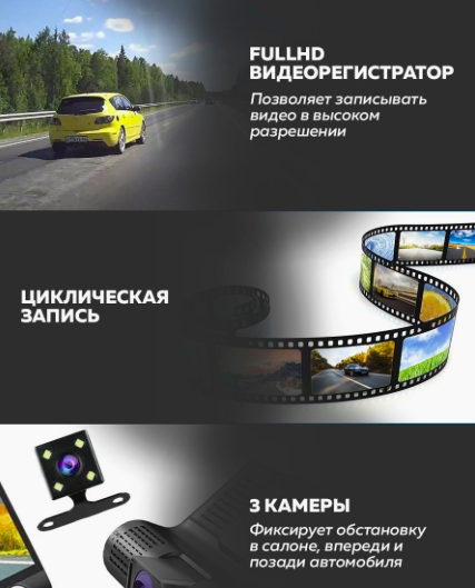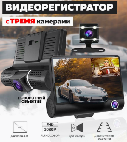 Описание: Автомобильный видеорегистратор 3 в 1 от магазина BARBUD с камерой в салон, впереди и позади автомобиля - то, что отличает гаджет от аналогов. Разрешение FullHD 1080 позволяет записывать поездку в хорошем качестве. Угол обзора передней видео камеры 170 градусов (задней видеокамеры 120) захватывает все происходящее на дорожном полотне, фиксируя до 5ти полос проезжей части, включая обочину. Дисплей с диагональю 4 дюйма ( монитор автомобильный 4") и встроенные динамики позволяют просматривать видеоматериалы непосредственно на устройстве и не мешают зеркалу заднего вида. Для хранения автомобильным гаджетом (камера видеонаблюдения) поддерживается карта памяти для видеорегистратора Micro SD (флешка 32 Гб). Регистратор для автомобиля разработан с учётом ситуаций, способных возникнуть на дороге: тряска, резкие остановки и столкновения. Видеорегистратор в автомобиль имеет G-сенсор (G-sensor) и датчик движения. В критической ситуации данные не будут утеряны. Авторегистратор может внести ясность в спорные ситуации, защитить вас от подстав, подтвердить, что вы проехали на мигающий зеленый или желтый сигнал светофора. Благодаря небольшим размерам видеорегистратор автомобильный 3 в 1 не мешает обзору водителя и прекрасно впишется в интерьер Вашего автомобиля (все для салона автомобиля, машины, видеорегистраторы автомобильные под интерьер авто, автоаксессуары в салон автомобиля). Автодевайс работает от сети, кабель (шнур, провод) зарядного устройства в комплекте. Регистратор в машину с тремя камерами имеет меню на русском языке. Видеорегистратор уверенно справляется с низкими и высокими температурами благодаря суперконденсатору. Преимущества нашего видео регистратора ( не антирадар 3 в 1, не радар детектор, не навигатор автомобильный): отличное разрешение съемки, простая установка регистратора автомобильного 3 в 1, хороший угол обзора, циклическая запись одновременно с трех камер. Также на данную модель авторегистратора действует гарантия 3 месяца со дня приобретения. Наши аксессуары для автомобиля - отличный подарок для любого автолюбителя, мужчинам на день рождение и любой другой праздник! Автотовары и аксессуары в автомобиль без wifi (автоэлектроника и навигация), видеорегистратор автомобильные без gps - выбрать и купить другие аксессуары и доп. оборудование с Barbud просто. Не забудьте снять защитную пленку наклейку со стекла экрана. Отлично подходит, как видеорегистратор в такси. КАРТА ПАМЯТИ в комплект НЕ входит. Видеорегистратор автомобильный 3 в 1 - фиксируйте происходящее с BARBUD!