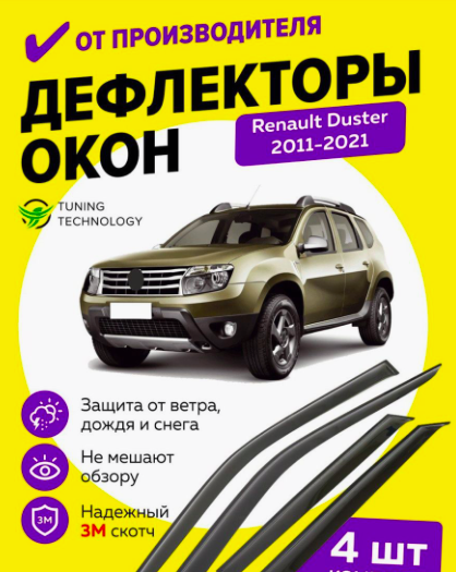 Описание: Ветровики на окна разработаны специально для Renault Duster (Рено Дастер) 2011-2021.► Что даёт установка дефлекторов на окна? При любых погодных условиях защищают салон авто от воды, снега и грязи Улучшают аэродинамические характеристики автомобиля, изменяя движение потока воздуха, не давая ему попасть в салон, тем самым устраняя эффект парусности и уменьшая расход топлива Дефлекторы окон - это декоративный элемент, который может украсить и подчеркнуть индивидуальность автомобиля► Материал изготовления и способ крепления Наши ветровики на окна автомобиля производятся из лёгкого и высококачественного оргстекла, устойчивое к УФ излучению и с высокой светопроницаемостью. Крепятся с помощью качественного скотча 3М, произведённого в Германии. Установка не требует сверления и занимает в среднем 5-10 минут.★ Уважаемые клиенты! Обращаем ваше внимание, что дефлекторы имеют форму, соответствующую модели данного автомобиля. Фото в карточке товара типовое, служит для визуального восприятия товара.Дефлектор для и на авто , дефлекторы боковых окон , ветровики на окна , на машину , автомобильные дефлекторы
