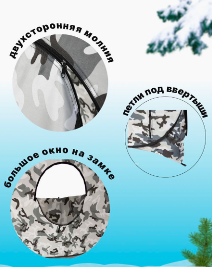 Описание: Зимняя палатка-автомат уникальное изобретение, которое позволяет установить временное жилище за считанные секунды. Тент палатки зимней сшит из плотной ткани Oxford адаптированной к низкотемпературным режимам, характеризуется высокой прочностью и устойчивостью к влаге. Дно снабжено специальным отверстием для лунок, закрывающимся на молнию. Это очень удобно. В палатке для зимней рыбалки с полом рыболову ловить гораздо комфортнее, теплее. По углам палатки туристической сделаны петли под ввертыши, для надежного фиксирования на льду. Есть большое окно на замке, регулирующее микроклимат внутри. Вход в палатку закрывается двухсторонней молнией, что обеспечивает удобное закрытие и открытие входа. Светлые стенки палатки не нарушают освещенность при ловле в пасмурную погоду. Палатка зимняя автомат мгновенно раскрывается и быстро складывается обратно в круглый чехол-переноску. Легкая и компактная зимняя палатка для рыбалки, пригодна для частого использования.