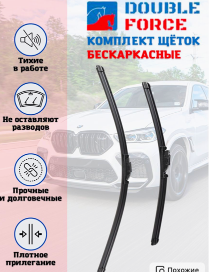 Описание: Щетки стеклоочистителя для Chery Tiggo 7 Pro 2020 - (Чери Тигго 7 Про) (комплект 550/450 мм.Крючок) Конструкция бескаркасных щеток Дабл Форс обеспечивает высокие аэродинамические характеристики. Поток воздуха дополнительно прижимает дворник к стеклу, а также образует меньше шума на высокой скорости. Стеклоочистители в меньшей степени подвергаются влиянию снега и льда. В конструкции нет шарнирных соединений, которые чувствительны к обледенению и загрязнению. Низкий профиль бескаркасных дворников обеспечивает максимальную обзорность на дороге. В комплекте поставляются адаптеры, на обратной стороне коробки изображены поводки и переходники к ним, что позволит без труда определить какой именно адаптер нужен для вашего автомобиля. После установки не забывайте снимать защитную ленту с резинок.