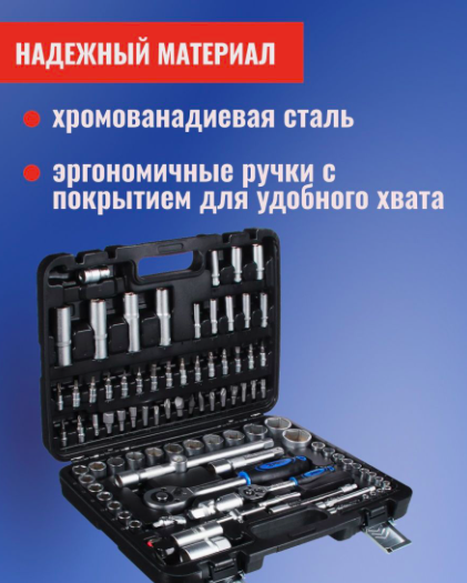 Описание: Сталь 45. Торцевые головки 6-гранные 1/4 13 штук: 4; 4.5; 5; 5.5; 6-14 мм. Головки 1/4 длинные 6-гранные 8шт: 6-13 мм. Ключ трещоточный с быстрым сбросом 1/4 Удлинители 1/4 2шт: 50; 100мм Шарнир карданный 1/4 Переходник 1/4 - 2шт. Гибкий удлинитель 1/4 Ключи 6-гранные Г-образные 3шт: 1.5; 2; 2.5 мм. Отвертка с присоединительным квадратом 1/4 (вороток) Вороток Т-образный 1/4 Головки 1/2 6-гранные 18 штук: 10-24; 27; 30; 32мм. Головки 1/2 длинные 6-гранные 4шт: 14; 15; 17; 19мм Ключ трещоточный с быстрым сбросом 1/2 Удлинители 1/2 2шт: 125мм; 250мм. Шарнир карданный 1/2.Головки свечные 1/2 2шт: 16; 21мм.Переходник 1/2 - 3/8. Битодержатель 1/2. Биты 5/16 15шт: Шестигранные (HEX):8; 10; 12; 14мм. Шлицевые (SLOTTED): 8; 10; 12мм. С внешней звездой (TORX): 40; 45; 50; 55мм. PHILLIPS: 3; 4мм. POZIDRIV: 3; 4мм. Отверточные торцевые головки 1/4 17 шт: 6-гранные (HEX):3; 4; 5; 6мм. Шлицевые (SLOTTED): 4; 5.5; 7мм. С внешней звездой (TORX): 8; 10; 15; 20; 25; 30мм. PHILLIPS: 1; 2мм. POZIDRIV: 1; 2мм. Материал: хромованадиевая сталь.
