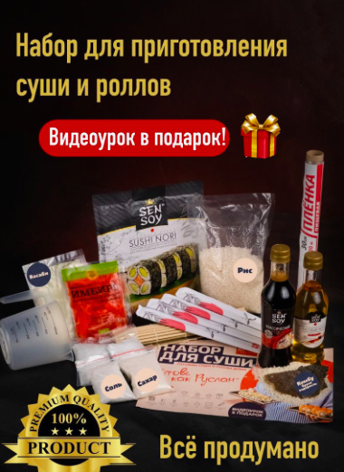 Описание: Привет, дорогой друг! Приобретай мой набор и я научу тебя готовить суши и роллы у себя дома, как это делают настоящие японцы! Набор «Готовь как Руслан» - отличный подарок любой хозяйке, любителям готовить дома, гурманам, ценителям японской кухни, суши и роллов. У тебя есть уникальная возможность самостоятельно приготовить самые вкусные роллы своими руками, под чутким руководством опытного шеф повара, обученного мастерству японской кухни Японцами.Удиви любого гурмана роллами как в Японии, приготовленными ТВОИМИ руками с помощью подробного видеоурока, который находится внутри набора.Ты научишься готовить заправку для риса, правильно варить и мариновать его, закручивать роллы простым способом, делать такие авторские суши, которые не приготовят в ресторане. В наборе для тебя есть все необходимое! Я бережно и тщательно отбирал все составляющие набора по качеству и количеству. Тебе нужно только купить рыбу и/или любую другую начинку для роллов по твоему вкусу. Внутри набора есть описание, где будут предложены подробные рецепты от классической филадельфии, до моих авторских хенд роллов. Видеоурок от меня в подарок! В нем я подробно расскажу и научу тебя готовить суши! У тебя получатся самые вкусные и свежие роллы, лучше, чем в любом ресторане! Комплектация набора: соевый соус 250 мл, листы нори 10 шт, рис 500г, маринованный имбирь 100г, порошок васаби 50г, перчатки одноразовые 2 пары, коврик для приготовления роллов 1 шт, мерный стакан 1 шт, уксус для риса 220мл, сахар 80г, соль, 20г, водоросли Комбу, 1 шт, палочки для суши 4 шт, пищевая стрейч пленка 1 шт, описание с рецептами, ключ к видеоинструкции. Приготовив один раз сам– ты поймешь разницу во вкусе и свежести роллов, не захочешь пользоваться доставкой суши, полюбишь процесс приготовления настолько, что обязательно будешь готовить с любовью и душой!