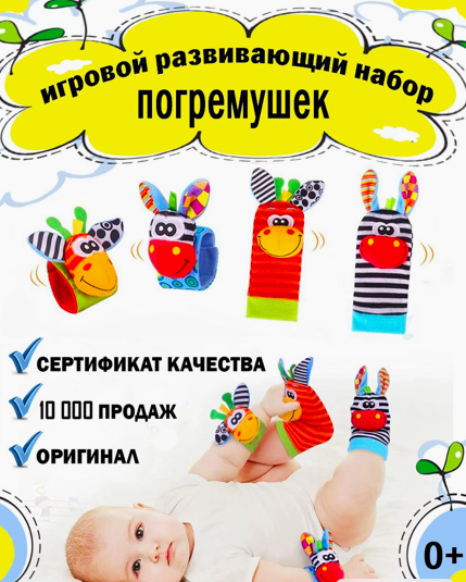 Описание: НАШ ТОВАР СЕРТИФИЦИРОВАН И ЯВЛЯЕТСЯ ОРИГИНАЛОМ, В ОТЛИЧИИ ОТ ДРУГИХ, ПРЕДСТАВЛЕННЫХ НА САЙТЕ! ЯРКИЙ ИГРОВОЙ И РАЗВИВАЮЩИЙ НАБОР ИГРУШКИ для детей - ПОГРЕМУШКИ для новорожденных (4шт, состоящий из носочков и браслетиков на липучках) с хрустящими ушками, создан специально для малышей 0+. Игровой набор для самых маленьких отлично развивает моторику, координацию, внимание, хватательные рефлексы, а так же благодаря ДЕЛИКАТНОМУ ЗВУКУ, способствует развитию слуха. Игрушки станут прекрасным подарком на выписку из роддома и незаменимой помощью для мам новорожденных, ведь малышей он увлечет на продолжительное время, освободив время родителям. Многие мамочки заметили, что детки научились сами переворачиваться, в процессе игры с веселыми и яркими погремушками. Данный развивающий набор отлично подойдёт деткам до 8мес. Дорогие родители, мы напоминаем, что младенцы воспринимают звуки намного чувствительнее, чем мы с Вами ) И то, что для Вас "не громко" , для малышей иначе! Данные погремушки незаменимый подарок на выписку, крестины, день рождения малыша