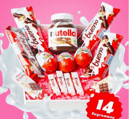 Описание: Состав ореховая паста Nutella-180 г., Kinder сюрприз-3 штуки, Kinder bueno - 4 штуки, Kinder со злаками - 2 штуки, Kinder chocolate - 4 конфеты