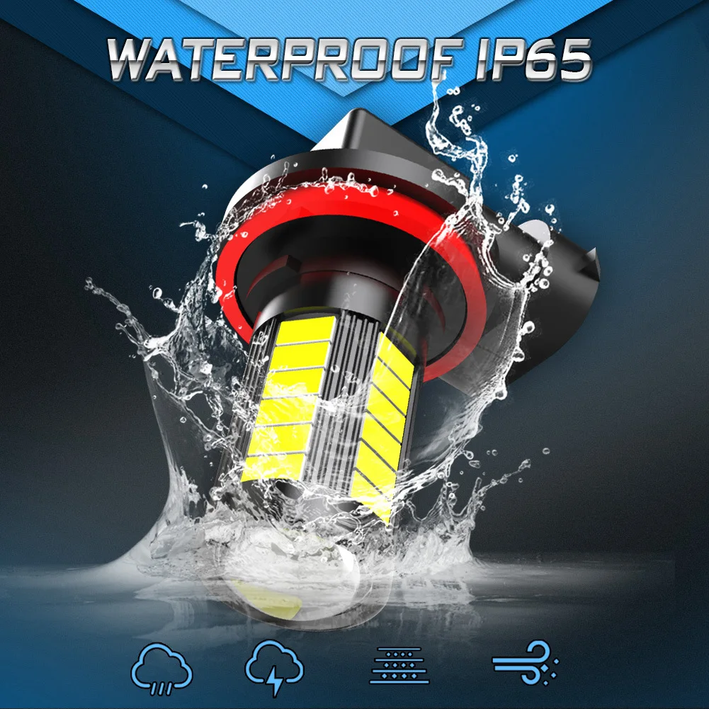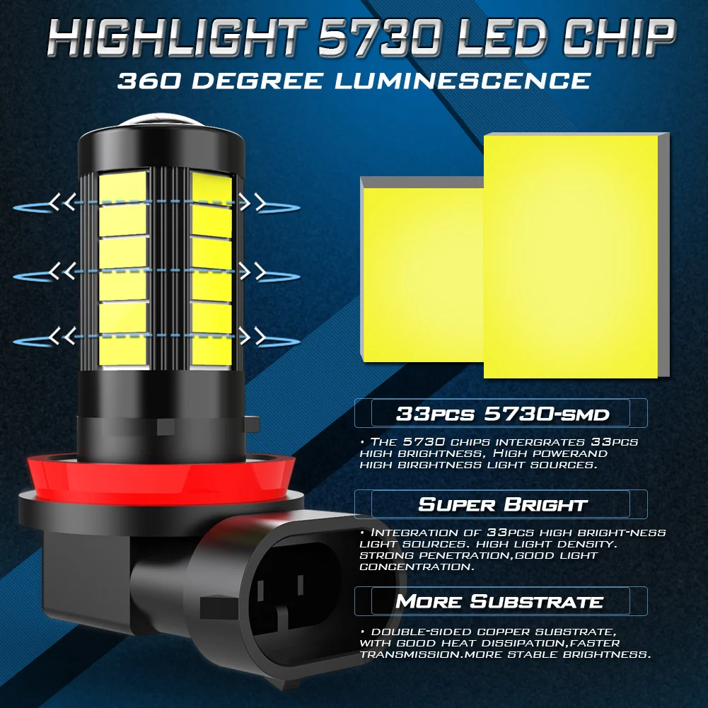Гнездо: H11/H9/H8/H16(JP), 9005/HB3, 9006/HB4,H10 Светильник источник: 33 штуки; 5730SMD Люмен: 1200лм Рабочее напряжение: 12 В постоянного тока Цветовая температура: 6500K белый Рабочая температура: -40-80 градусов Цельсия Срок службы: более 60 000 часов Угол луча: 360 градусов Использование: для DRL, противотуманный светильник s, дневной ходовой светильник