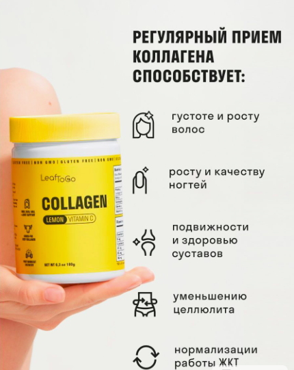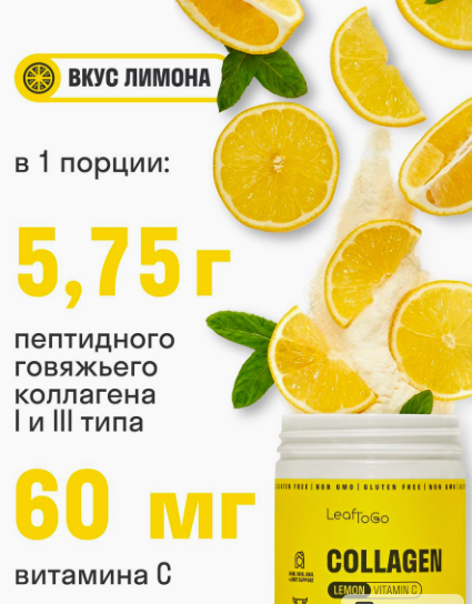 Описание: Сollagen LeafToGo - это продукт, созданный из высококачественного пептидного коллагена. Коллаген порошок - это важнейший белок, из которого строятся соединительные ткани, прежде всего - связки и суставы, требующие прочности и эластичности, так же он входит в состав кожи, а еще волос и ногтей, обеспечивая их рост и красоту. Важно принимать коллаген вместе с витамином C, который уже есть в составе. Противопоказания: индивидуальная непереносимость компонентов, беременность и ГВ. Перед применением проконсультироваться с врачом. Не является лекарственным средством. Есть сертификат Халяль. Состав: пептидный говяжий коллаген, витамин С (аскорбиновая к-та), витаминный премикс ((витамин B3 (ниацин), Е (альфа-токоферола ацетат), В5 (кальция пантотената), В12 (цианкобаламин), В6 (пиридоксин гидрохлорид), В1 (тиамина мононитрат), А (ретинола ацетат), В2 (рибофлавин), В9 (фолиевая к-та), D3 (холекальциферола), В7(биотин)), ароматизатор и сукралоза (менее 0,02%).