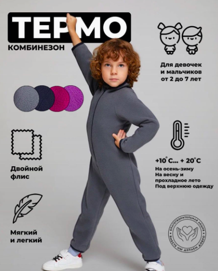 Описание: Детский утепленный флисовый комбинезон для мальчика и для девочки - удобный и практичный вариант одежды на каждый день. Изготовлен из высококачественного двухстороннего флиса, что позволяет сохранить тепло, отводить влагу, обеспечивая хорошую терморегуляцию. Однотонная поддева не требует глажки, выдерживает многократные стирки, не деформируется, не линяет и не скатывается. Костюм утепленный из футера, приятен в носке, не сковывает движения даже самых активных детей. Воротник стойка. Резинки не вшиты, тем самым не передавливают ручки и ножки, плотно сидят за счет тонких манжетов, которые не мешаются малышам. Термокостюм защитит ребенка от холода и ветра и заменит в гардеробе многие детские вещи, которые занимают много места. Идеально на прогулку: комбинезон защитит спину вашего ребенка от холодного ветра. Можно надевать под куртку или пальто, в более теплое время использовать как самостоятельную одежду для прохладных вечеров. Отлично подходит для дома и улицы, дальних поездок, походов в школу и детский сад, на прогулку, а также их можно использовать как спортивный комбинезон для активного отдыха. Комбинезон детский - это идеальный вариант детской одежды для длительных прогулок осенью, весной, прохладным летом или в качестве поддёвы под зимнюю одежду! Является отличной базовой одеждой на каждый день. Удобно надевать ребенку самостоятельно и переодеваться за считанные минуты. Вы подберете цвет на любой вкус: синий, серый, розовый, бордовый, фуксия. Размерный ряд 98 104 110 116 122. Универсальный демисезонный комбинезон нашего бренда порадует маленьких модников! Идеально на подарок дочке, сыну, брату, сестре, племяннику, крестнику (крестнице) на день рождения, новый год и просто без повода. Сотворим Добро вместе. С ваших заказов, мы отправляем в различные проверенные фонды на благотворительность 1%, тем самым мы сможем помочь деткам, которым необходима помощь.