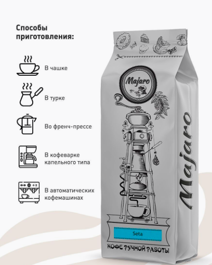 Описание: Majaro - это настоящий бразильский кофе, 100 % арабика. Бразилия славится своим “ароматным золотом”. Плантации расположены в экологически чистых местах. Сухой, солнечный мягкий климат идеально подходит для выращивания сорта кофе. Зерна получаются крупные. Обработанные сухим способом, сохраняют в себе сладость и насыщенность кофейных ягод. Натуральная сладость сохраняется в каждом глотке.Благодаря качествам кофе, идеально сочетается с натуральным и растительным молоком. На основе эспрессо, американо получаются вкусные, насыщенные кофейные продукты: латте, капучино, глясе, ice-cofe. Кофе в зернах 1 кг можно преподнести в качестве презента дорогим, близким людям: жене, мужу, начальнику. Приобрести для дома или для кофейни. Espresso - это зерна высшего сорта, крупного размера. Имеет легкую кислинку, среднюю горечь и легкую сладость. Яркая горечь темного терпкого шоколада во вкусе, разбавляется легкими нотками фруктового послевкусия. Стойкий аромат жареных орехов и крепкая, густая пенка - рецепт идеального начала бодрого утра. Black Espresso - колумбийские зерна, выращенные в высокогорной местности. Чистый, сбалансированный вкус яркой, сочной клюквы в тандеме со спелым грейпфрутом. Лёгкая горечь и терпкость орехов, смягчается сладостью молочного шоколада. Вкус кофейного напитка раскрывается в сочетании с молочными напитками, сливками. Идеальная база для капучино, латте, ice-cofe. Растительное молоко: кокосовое, миндальное, фундучное тоже станет отличным ингредиентов в сочетании с black espresso. Classic - стопроцентная бразильская арабика. Аромат жареных орехов и душистых пряностей. Сладость, кислинка и горечь гармонично сплетаются в густое, кремовое тело. Чувствуется яркий вкус шоколада. Любой ценитель напитка, почувствует терпкий, крепкий вкус фундука и сладость сочных, желтых фруктов. Стойкий шлейфовый аромат. В композиции ощущается пряность дымного табака, с мягкой терпкостью. В букете выдержан баланс вкусовых качеств. В равных пропорциях чувствуется горечь, сладость, кислинка. Safari - для любителей классического, мягкого и нежного эспрессо. Винный кисло-сладкий аромат, плотная крема. Во вкусе можно ощутить сладкие ноты цветочного меда, в первых тонах вкуса. Разбавляет сладость кислинка спелого абрикоса. Для баланса сладости, в конце можно ощутить горечь пряного грецкого ореха. Пряный, терпкий шлейфовый аромат орехов подарит кофейному отлично сочетается с молочными напитками. Кислотность 3 из 5-ти. Легкая горечь 2 из 5-ти, в меру подобранная сладость 3 из 5-ти. Seta – это вкусовая композиция классического эспрессо. Которое так любят кофейные гурманы. В структуре напитка, плотная насыщенная текстура. Насыщенный вкус жареных орехов, с ароматом темного шоколада и дымкой. Отличная база для приготовления кофейных напитков, легко сочетается с растительным, коровьем молоком и сливками. Молочный вкус раскрывает полностью кофейный букет. Каждый букет бразильского кофе Majaro - это стопроцентная арабика. Наличие в составе липидов и сахаров, делают вкус интенсивным и кислотным. В конкретном сорте арабики из конкретного региона можно почувствовать сладость ягод, кислотность цитрусовых, аромат цветов и орехов.Компания MAJARO производит свежеобжаренный кофе с 2012 года. Закупает зеленые кофейные зерна высочайшего качества из Африки, Азии, Центральной и Южной Амери