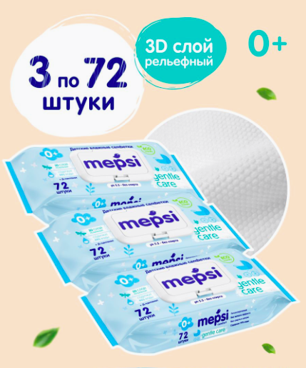 Описание: Влажные салфетки Mepsi – это надёжный спутник каждой мамы, который легко помещается в кармане, сумочке или коляске. Просто возьмите компактную упаковку с собой, и каждая из салфеток гарантированно обеспечит бережное очищение нежной детской кожи в нужный момент.Уходовая косметика для малышей Mepsi изготавливается из гипоаллергенных материалов и не содержат спирта: вместо него в состав вошли эфирное масло ромашки, гель алоэ, витамин Е и Д-пантенол, благодаря этому средство личной гигиены Мепси идеально подходит для чувствительной кожи новорожденных. Салфетки Mepsi обеспечивают качественное увлажнение, питание, сохраняя кожу малыша чистой и здоровой: абсолютная безопасность и улучшенная структура салфеток позволяет использовать их с первых дней жизни ребёнка.Одноразовые салфетки Mepsi справятся с любыми загрязнениями: надёжное очищение достигается за счёт специальной рельефной 3D поверхности, не пропускающей ни единого миллиметра грязи. Влажные салфетки эффективно очищают лицо, тело и руки малыша. Они не мылятся и не прилипают, в составе нет спирта, а наличие клапана на упаковке защитит их от высыхания: салфетки Mepsi действительно влажные, а не просто увлажнённые. Детские гигиенические салфетки Mepsi будут надежным помощником мамы при смене подгузника, в путешествиях и на прогулке, а так же подойдут на выписку новорожденного из роддома.