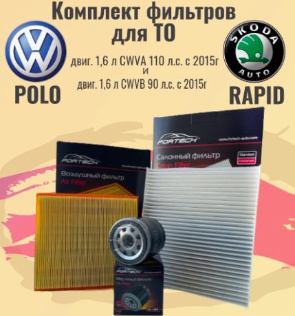 Описание: Набор фильтров для ТО для **VOLKSWAGEN POLO и SKODA RAPID двиг.1,6л CWVA 110 л.с. с 2015 г и двиг. 1,6л. CWVB 90л.с.** c2015 г. Фильтры произведены из материалов высокого качества от мировых лидеров, на современном оборудование, что позволяет соответствовать высоким стандартам ведущих производителей фильтров. Производство прошло международную сертификацию по стандарту ISO/TS 16949:2002. Масляный фильтр с перепускным клапаном, обеспечивает постоянное снабжение двигателя маслом, и антидренажным клапаном, предотвращает вытекание масла из фильтра. При производстве воздушного фильтра используется фильтровальная бумага AHLSTROM (Италия), обладающая превосходными характеристиками по фильтрации поступающего в двигатель воздуха, что важно для сохранения мощности двигателя и его ресурса. В набор входят аналоги: - Масляный фильтр 04E115561/04E115561B /04E115561D/04E115561H - Салонный фильтр 6R0820367/CU26010 -Воздушный фильтр 04E129620A /C21014 Комплект фильтров **Фольксваген Поло/Шкода Рапид**.