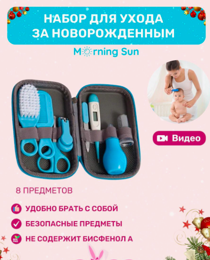 Описание: Предлагаем Вашему вниманию набор для ухода за детьми 8 в 1 от Morning Sun.В данном наборе находятся самые необходимые инструменты при уходе за новорожденными детьми. Гигиенический набор для ухода за ребёнком поможет Вам ухаживать за грудничком с самых первых дней жизни. В комплект входит:1) Детская расческа (1шт) (обеспечивает массажный эффект.)2) Детский термометр (1шт)3) Детская щетка (1шт) (улучшает кровообращение кожи головы и стимулирует волосяные луковицы, ускоряя рост первых волос малыша.)4) Пилочка для ногтей (3шт)5) Щипчики для ногтей (1шт)6) Детские ножницы (1шт) (безопасны и сделаны специально для мягких и маленьких ноготков)7) Устройство для носовой абсорбции (1шт)8) Силиконовая зубная щетка (1шт)Все предметы изготовлены из нетоксичных и безопасных материалов для Вас и Ваших детей. АБС-пластик является прочным и экологически чистым материалом, не имеет запаха. Отличный вариант для подарка на рождение ребенка!