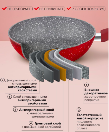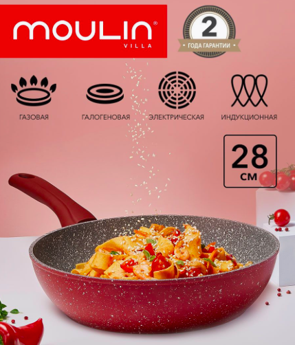 Описание: Глубокая сковорода антипригарная индукционная Moulin Villa 28 см сохранит сочность мяса, рыбы, овощей. На ней можно готовить с минимальным количеством масла. И не только жарить, но и тушить. Благодаря толстому дну и стенкам еда в сковороде равномерно прогревается и быстро доходит до готовности. Высокие борта делают посуду идеальной для блюд, которые надо готовить с сохранением жидкости. Например, рагу, соусов. Отлично подойдёт для паэльи, плова, пасты. В то же время она хороша для жарки котлет, драников, отбивных, яичницы. Сковородку с толстым дном толстостенную большого размера можно назвать универсальной, она удобна для семьи из трёх-пяти человек. В ней можно готовить сразу на несколько дней. Выполнена из литого алюминия. Сковородки для индукционных плит из этого материала не такие тяжёлые, как чугунные. Но их эксплуатационные характеристики даже лучше, чем у чугунных. Литая посуда равномернее прогревается и дольше сохраняет тепло, чем штампованная. Семислойное антипригарное покрытие на водной основе PFluon, которое не содержит PFOA (перфтороктановая кислота), CADMIUM (кадмий), LEAD (свинец) защищает от нагара, надолго сохраняет привлекательный внешний вид сковородки. По практичности его можно сравнить с керамическим. Покрытие безопасно для здоровья и поможет оставаться в форме: требует минимального количества масла при готовке. Избавьте себя от лишних калорий! Не нуждается в замачивании, легко отмывается. Декоративное покрытие «мраморная крошка» придает сковороде особый неповторимый вид. Эргономичная ручка из бакелита не нагревается и не плавится, обеспечивает безопасное использование сковородки в процессе приготовления пищи. На сковороде глубокой с бакелитовой ручкой можно готовить без прихватки. Благодаря интегрированному в дно сковороды ферромагнитному диску подходит для любой плиты: электрической, газовой, индукционной, а также для стеклокерамических плит. Сталь наделяет сковороду магнитными свойствами, необходимыми для индукции. Диск из нержавеющей стали также обеспечивает дополнительную жёсткость посуды и её устойчивость. Сковороду можно мыть как вручную, так и в посудомоечной машине, с использованием средств с нейтральным уровнем pH или специально предназначенных для алюминиевых изделий. Ручка не съемная. В комплект не входит крышка, вы можете подобрать её отдельно. Рекомендуем накрывать сковороду крышкой 28 см.
