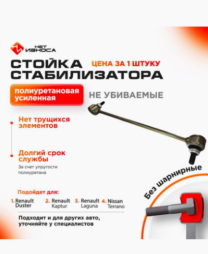 Описание: Усиленная стойка стабилизатора для легковых автомобилей от надежной марки Нет Износа. Мы занимаемся изготовлением автозапчастей для машин более 10 лет. Благодаря собственному производству стойка переднего (заднего) стабилизатора без пыльника очень качественная и надежная, а все аксессуары для автомобилей проходят тщательную проверку. В наличии представлено более 500 артикулов различных запчастей на легковые автомобили. Вы можете задавать любые вопросы по товарам, наши специалисты проконсультируют Вас и помогут подобрать подходящую запчасть к автомобилю из каталога. Цена за 1 шт. Наша неубиваемая стойка стабилизатора полиуретановая без шарнирная выполнена по особой технологии, в которой шаровой шарнир заменен на сайлентблок, что увеличивает срок службы стойки переднего, заднего стабилизатора. Мы уверены в качестве наших автозапчастей для автомобилей и предоставляем гарантию на усиленную стойку стабилизатора для легковых машин и другие автотовары 2 года!Размеры: длина между осями 295 мм, диаметр болтов 10мм, угол разворота болтов 180 градусов. Подходят на следующие авто: Renault Duster, HSA, HSM Renault Kaptur Renault Latitude Renault Talisman Рено дастер, Рено каптюр, Рено Латитуд, Рено Талисман. OEM-номер: 8200814411; 51848645; 551103022R; 546180001R стойка стабилизатора дастер