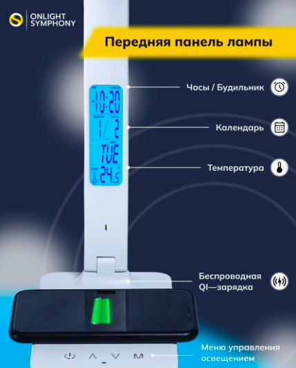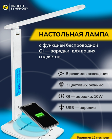 Описание: Дорогие покупатели! Не знаете, какую выбрать настольную лампу ? Российский бренд ONLight избавил вас от долгих поисков, разработав необыкновенный умный светильник, работающий от USB зарядки. Осветительный прибор многофункциональный: он содержит беспроводную зарядку для различных устройств и подойдет для телефона, электронных часов или наушников различных марок. Важно! Беспроводная зарядка для механизмов работает только с устройствами, которые поддерживают беспроводную зарядку QI! Сзади светильника расположен USB 5В/2.1А вход для зарядки мобильных устройств. Настольная лампа универсального белого и черного цвета. Оригинальный Led светильник с большим дисплеем, расположенным по центру. У светильника для дома множество преимуществ: 5 режимов яркости приятной подсветки, настраивается интенсивность теплоты свечения, легко переключается. Лампа светодиодная вертикальная на подставке, с крупными часами на экране. Гибкая поверхность позволит настроить свечение как вам необходимо. Можно установить будильник, посмотреть текущую дату или температуру. Покрытие: имитация кожи за счет чего приспособление будет полезным подарком на день рождения или другой праздник. Прикроватный ночник отлично подойдет для спальни, в детскую комнату, для уроков школьника, а также для чтения книг или для дачи. Лампа в том числе офисная, и хорошо будет смотреться в помещении лофт стиля. Лампа надежно упакована в коробку и будет доставлена в целостности и сохранности. Более 1000 человек успешно пользуются нашим настольным светильником и рекомендуют его. Спешите купить светильник для освещения по низкой цене со скидкой! iPhone поддерживают беспроводную зарядку, начиная с 8 модели - просим обратить внимание!