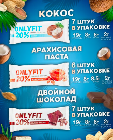 Описание: Протеиновые батончики ONLY FIT. Протеиновый батончик - это незаменимый помощник дополняющий правильное и диетическое питание. Здоровый перекус для тех, кто планирует быстрее избавиться от лишнего веса или набрать мышечную массу. Батончики ONLY FIT заменяют полноценный полдник, насыщают организм белком и полезными веществами. Высокое содержание белка поможет восстановить мышцы после физических нагрузок, а сбалансированный состав даст вам возможность порадовать себя полезной сладостью без вреда для фигуры. Спортивный батончик хорошая альтернатива сладким булочкам или пирожному, при этом маленький батончик удобно взять с собой и в любое время не отказать себе в здоровом лакомстве. В каждой шоубоксе 20 штук, это почти недельный запас в компактной для хранения упаковки.