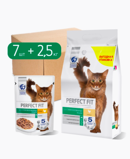 Perfect Fit Набор кормов PERFECT FIT, c курицей, сухой 2.5кг и влажный рационы, 7шт х 75г