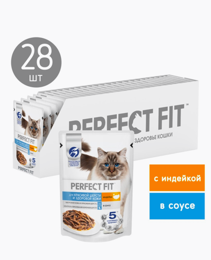 Perfect Fit Влажный корм PERFECT FIT для кошек для красивой шерсти и здоровой кожи индейка в соусе 28шт по 75г