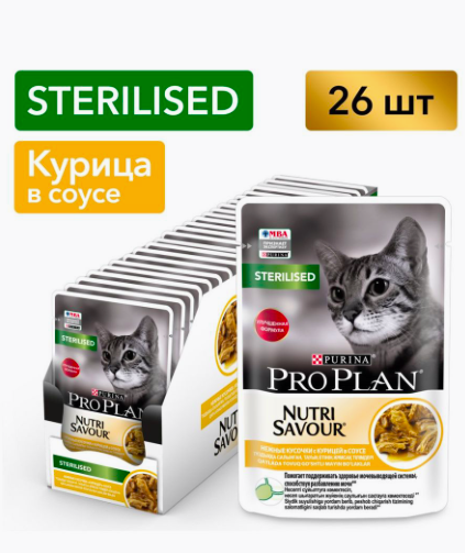 Описание: Влажный корм Pro Plan Nutri Savour для взрослых стерилизованных кошек и кастрированный котов, с курицей в соусе 26 шт х 85 г. Стерилизация способствует увеличению продолжительности жизни и снижает риски возникновения многих заболеваний. Однако стерилизованные кошки имеют свои особенности: после стерилизации кошка становится менее активной, повышается склонность к набору веса и развитию мочекаменной болезни. Эксперты PRO PLAN разработали влажный корм для стерилизованных кошек с учетом особых потребностей Вашего питомца.•Содержит высококачественный белок, который помогает поддерживать оптимальный вес•В корм для кошек входит комбинация витаминов, антиоксидантов и минералов для здоровья мочевыделительной системы•Влажные корма PRO PLAN содержат клетчатку для поддержания правильного пищеварения•Разнообразие вкусов и текстур: кусочки в соусе, паштет или нежное желе со вкусом говядины, курицы, индейки, утки или рыбы
