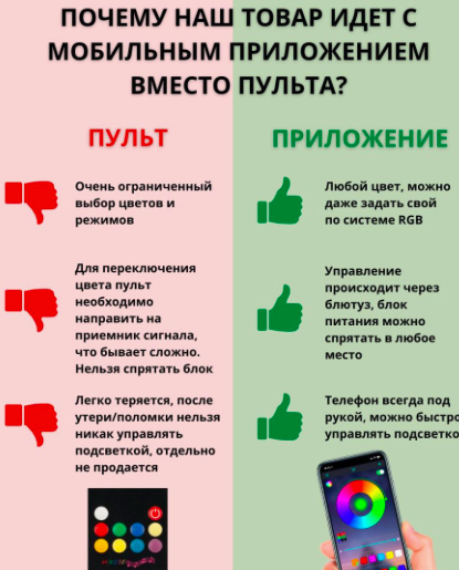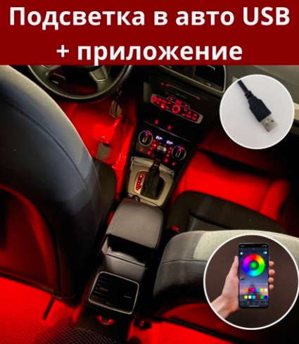 Описание: ВНИМАНИЕ! Подсветка салона автомобиля управляется через приложение на телефоне, а не при помощи пульта, поэтому пульт отсутствует в комплектации. Штатное освещение салона не всегда устраивает владельцев автомобилей, особенно если транспортное средство не относится к премиум-классу и производитель предпочел ограничиться минимально необходимым набором светильников. И тут очень помогают такие аксессуары в салон и багажник, как подсветка салона автомобиля, подсветка в машину под ноги, светодиодная лента RGB. Правильно выстроенная подцветка может преобразить любой автомобиль. Тюнинг авто не только сделает интерьер более эффектным, но и поможет лучше ориентироваться внутри автомобиля в темное время суток.Зоны подсветки. Дополнительная подстветка может устанавливаться во всех зонах салона. Но чаще всего используются следующие авто товары в салон и багажник для машины: Подсветка зоны ног. Подсветка в машину usb визуально расширяет пространство салона. Помогает легко обнаружить мелкие предметы, упавшие на пол автомобиля. Делает более комфортной высадку-посадку пассажиров в темноте. Подсветка в ноги в авто светодиодная в авто неоновая led лента напряжение 12В - подходит для любого автомобиля. Диодная подсветка ног в автомобиль контурная ргб лента может быть установлена самостоятельно, так как происходит подключение через прикуриватель (артикул 44527296) или USB (артикул 44596588). Подсветка ног в машину RGB лента - это светодиодная лента 22,5 см с влагозащитой на самоклеящейся ленте, имеет возможность выбора любого цвета и управление через мобильное приложение. Цветная светодиодная подсветка ног в автомобиль атмосферная - это свежо, оригинально, ярко, практично, надежно и долговечно. Подсветка автомобильная фоновая - стильный тренд этого года. Подсветка дверей и дверных ручек. Открытая в темноте подсвеченная дверь более заметна для проезжающих мимо автомобилей. При высадке из машины в темноте такое освещение помогает не попасть ногами в лужу или грязь. С подсветкой проще находить предметы, хранящиеся в карманах дверей. Подсветка торпедо. Имеет скорее декоративную функцию. Существенно влияет на общую эстетику салона, эффектно подчеркивая плавные линии приборной панели. Подсветка багажника. Помогает легко ориентироваться в багажном отделении любого объема даже ночью. Подсветка перчаточного ящика. Позволяет быстро найти в “бардачке” любые мелочи и документы. Контурная подсветка для автомобиля. Данный автотовар используется для украшения салона авто: тонкая светящаяся лента прокладывается по контуру отдельных элементов или “опоясывает” весь салон машины, создавая мягкую эффектную подсветку. Виды подсветки салона. Светодиодная LED лента. Для светового дизайна используются диодные ленты или точечные светильники. Не так давно на рынке появилась новая разновидность LED-подсветки – так называемый «гибкий неон». Это светодиодная лента, заключенная в прозрачную силиконовую оболочку. Такая подсветка отличается влагостойкостью и равномерностью свечения. Светодиодное освещение может быть как монохромным, так и многоцветным RGB светодиоды. С помощью специального приложения можно изменять не только цвет свечения, но и его интенсивность. Также есть возможность синхронизации подсветки с аудиосистемой и получить дополнительный 